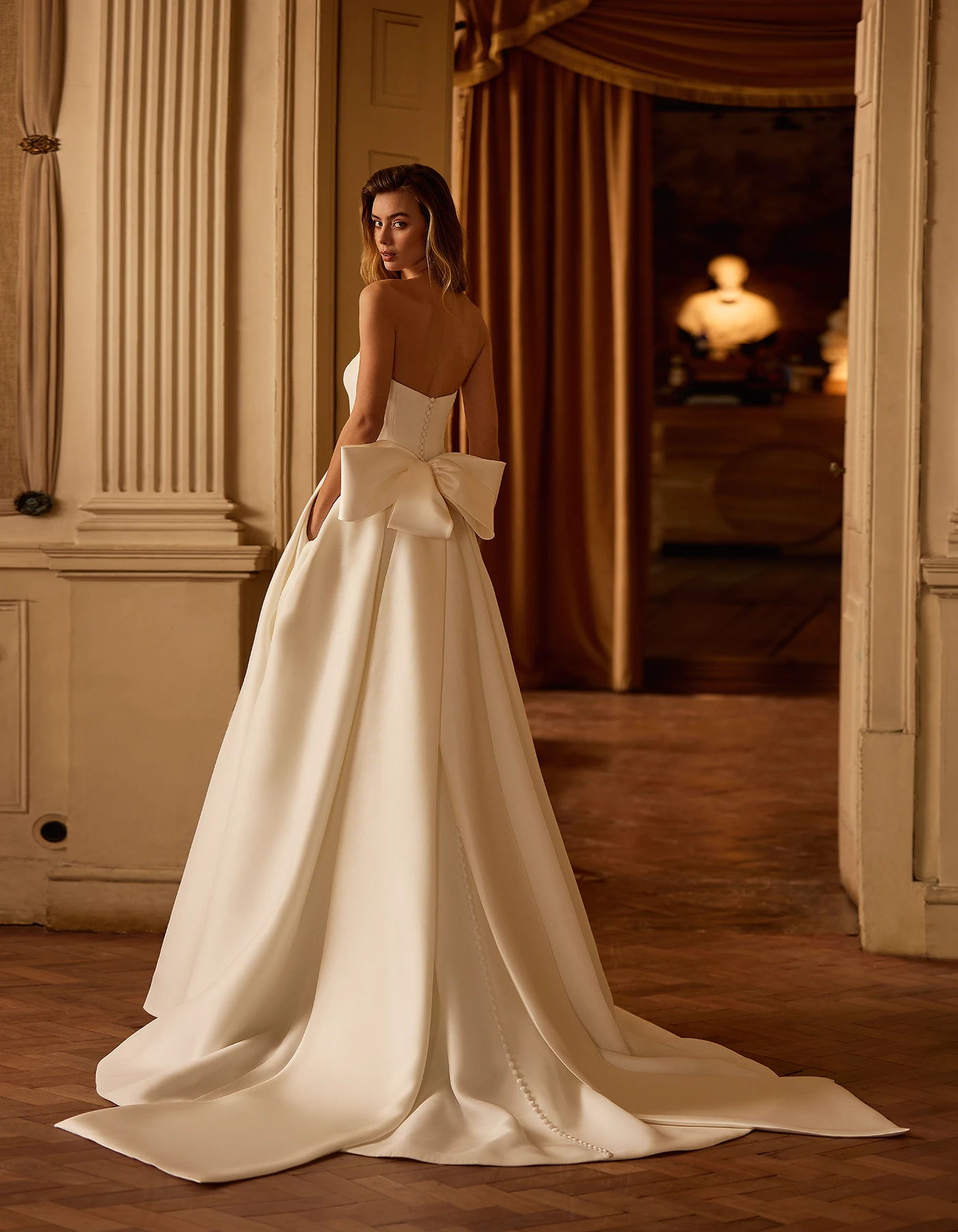 Vestido de novia de línea A de estilo clásico y romántico elaborado íntegramente en organza. Presenta un escote corazón y costuras creando el volumen de la falda. Lleva como complemento un lazo extraíble en organza generando un efecto de doble look.