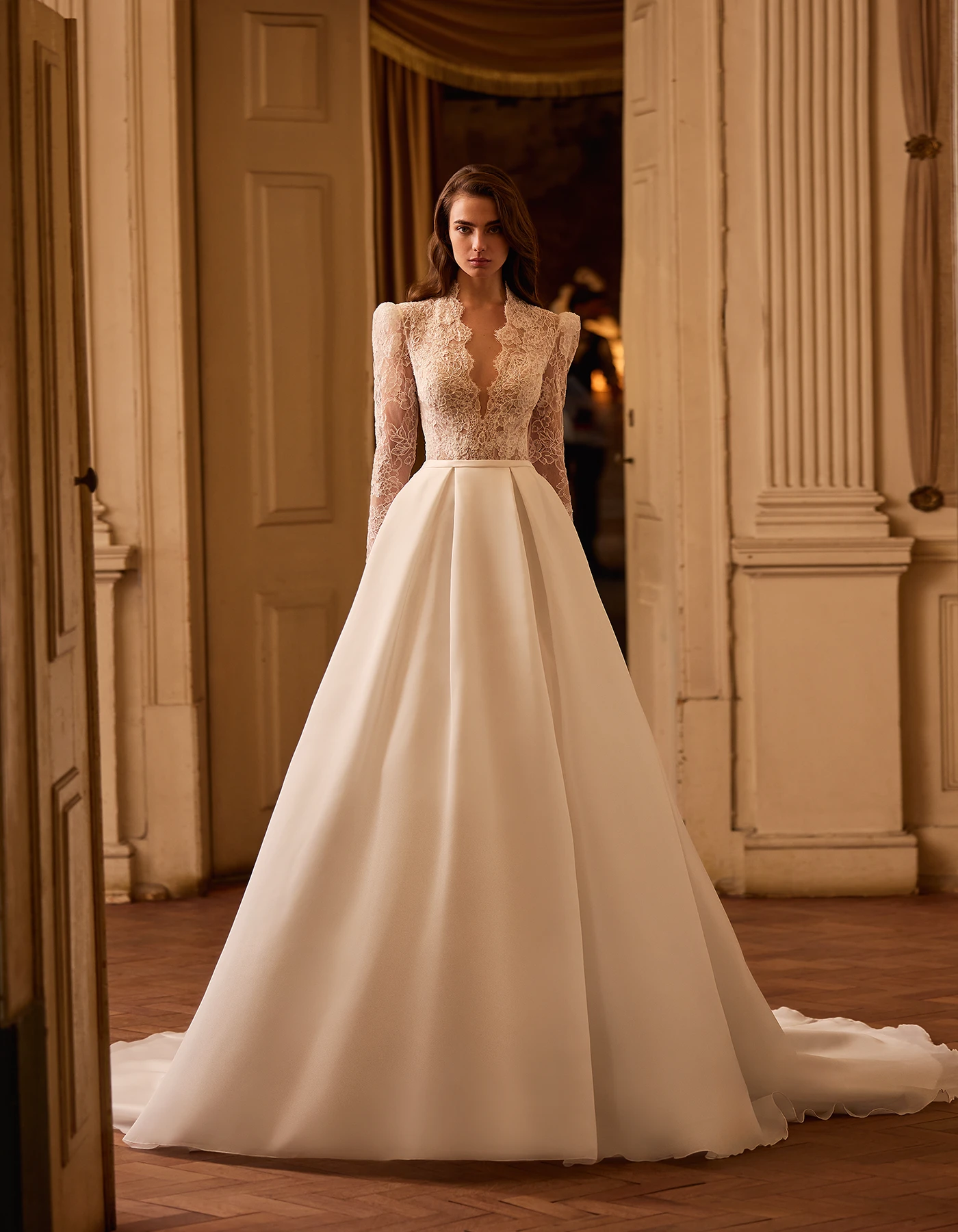 Vestido de novia princesa de estilo clásico que combina un cuerpo elaborado en encaje rebrodé y escote pico con sedosa falda de organza.