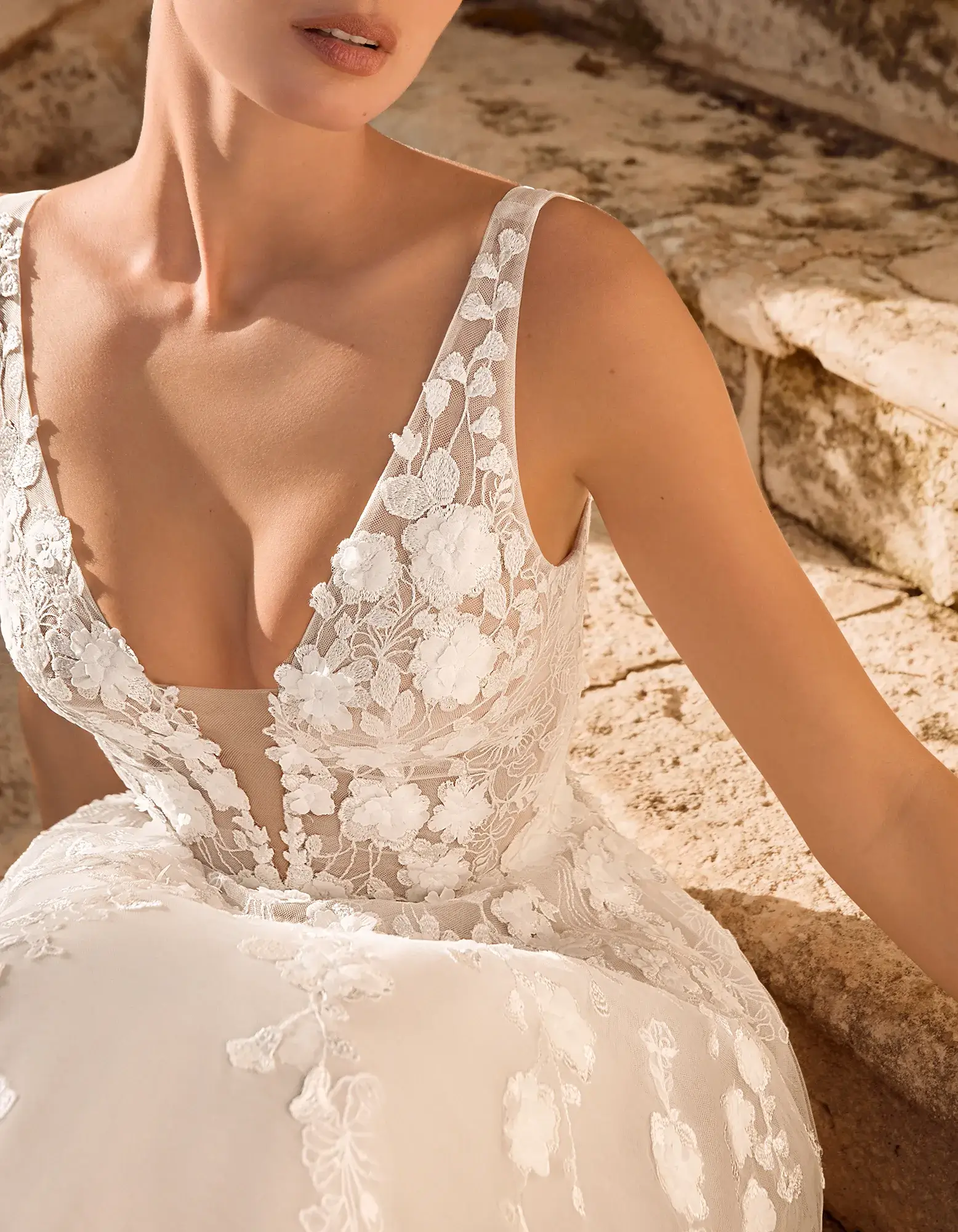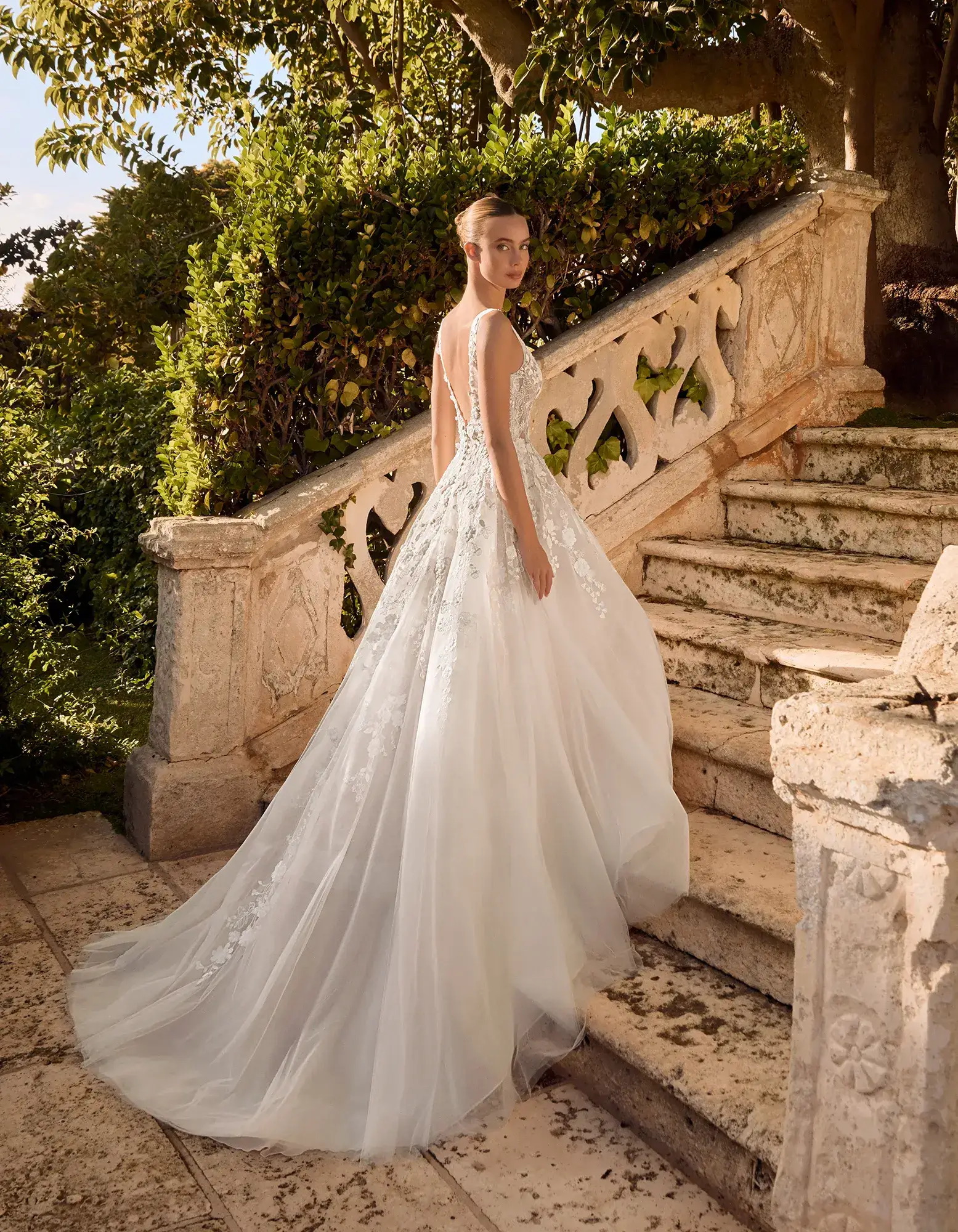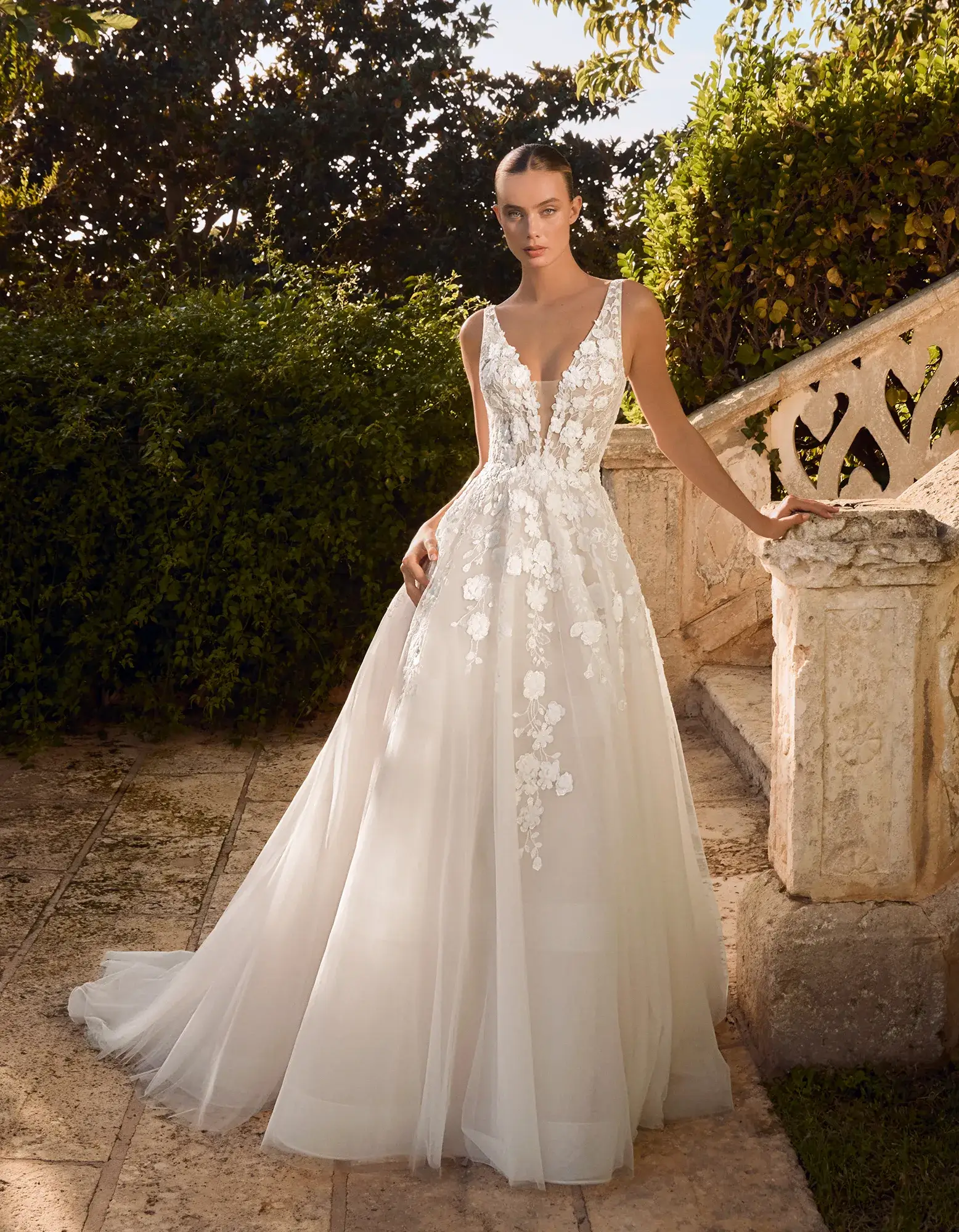 Vestido princesa de estilo romántico elaborado en tul con aplicaciones de encaje. Presenta un cuerpo con escote pico, espalda en V y detalles de flores 3D.