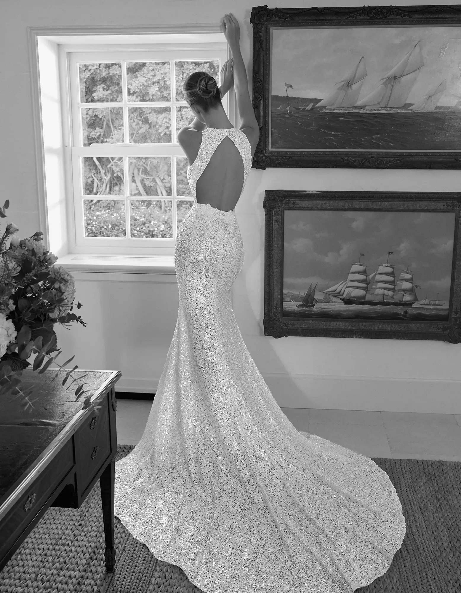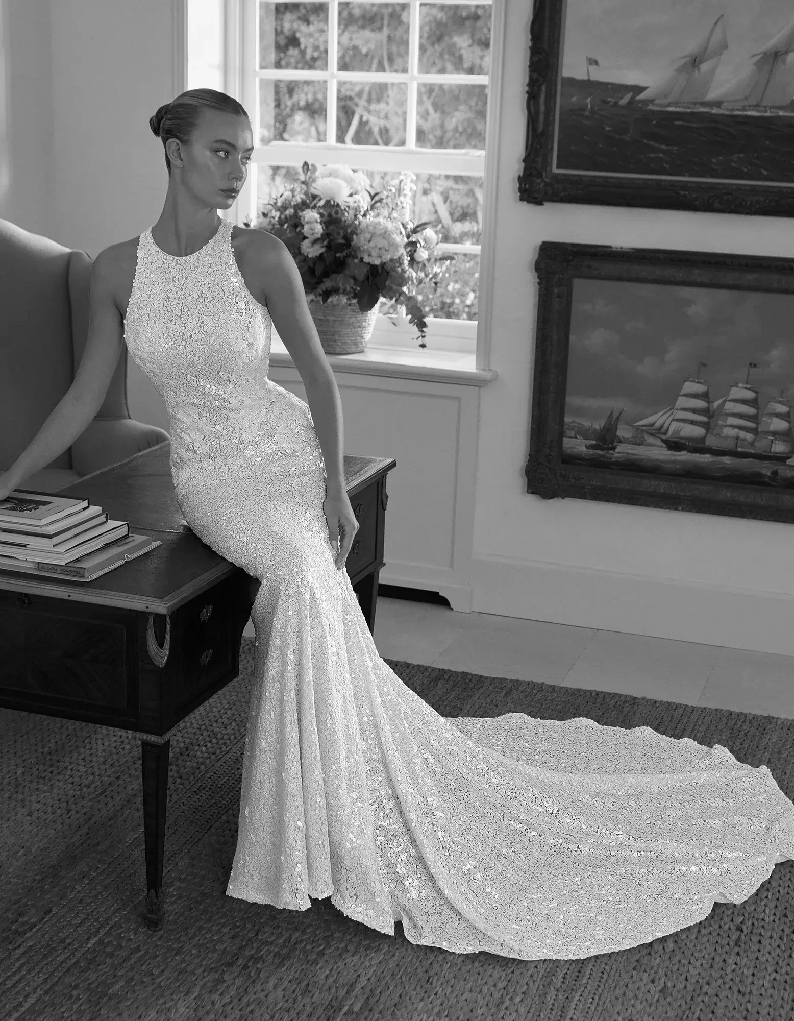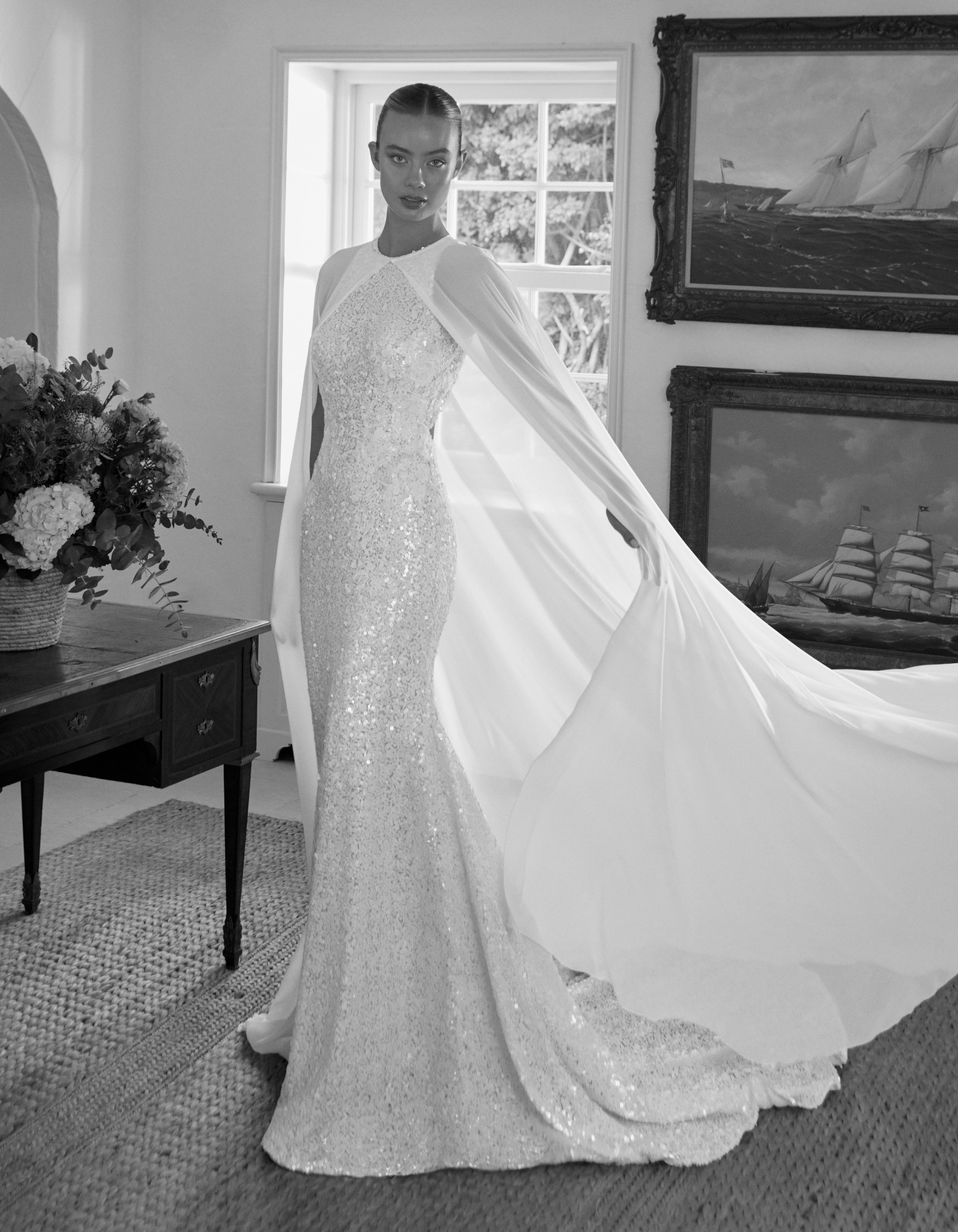 Vestido de sirena de estilo moderno confeccionado enteramente de pedrería, con cuello cerrado y abertura en la espalda. Presenta una capa de gasa sedosa como complemento, que da efecto doble look.