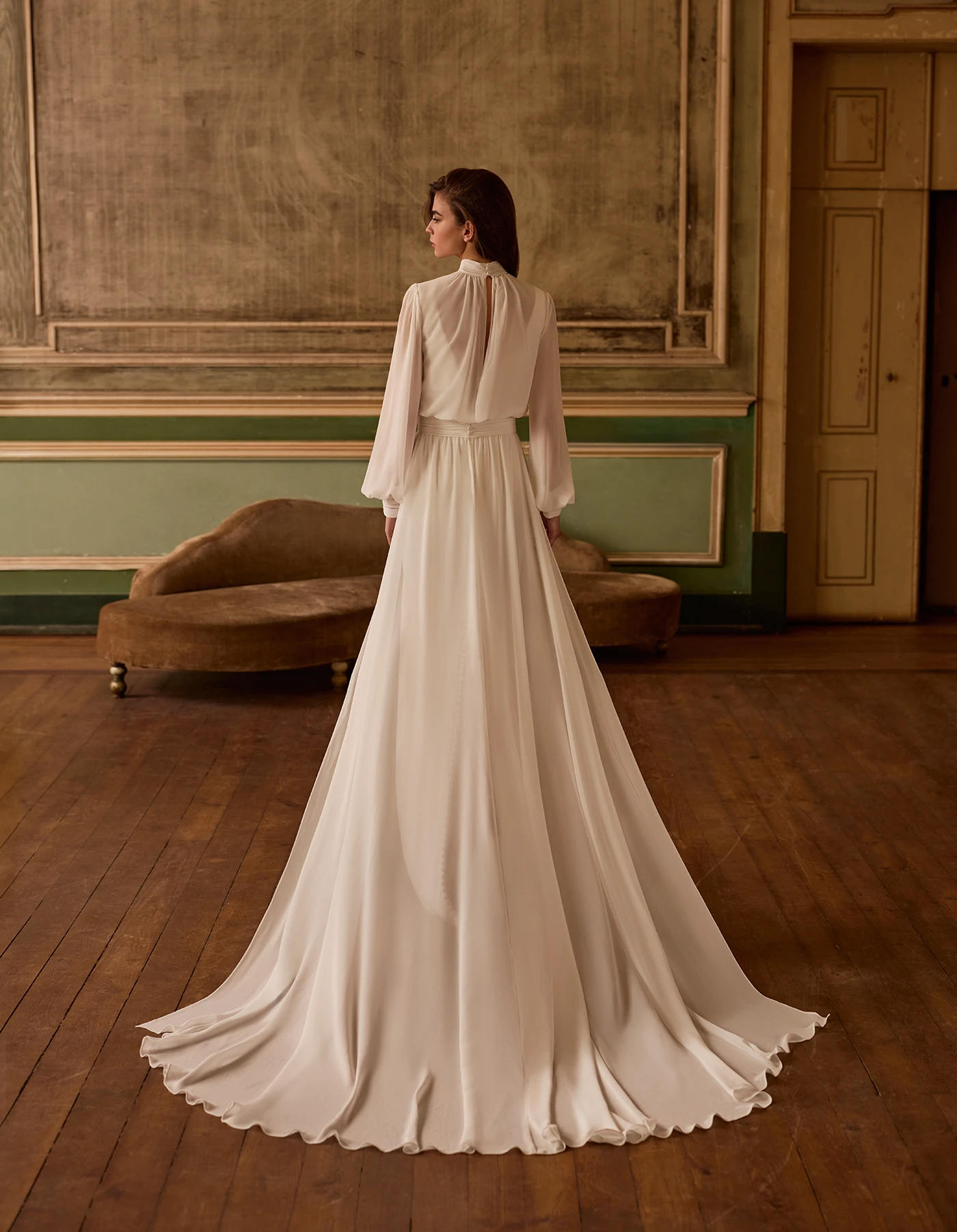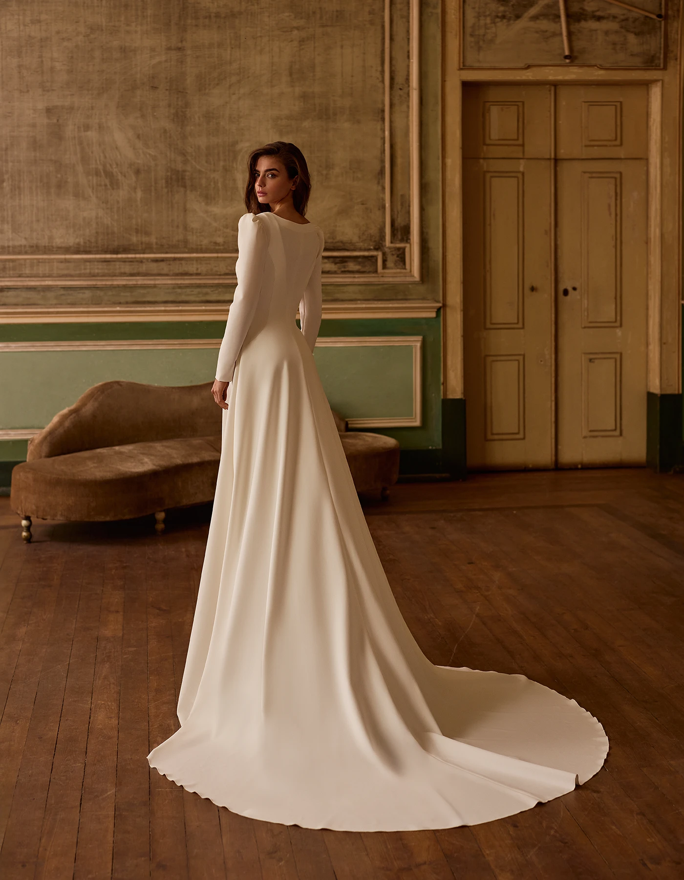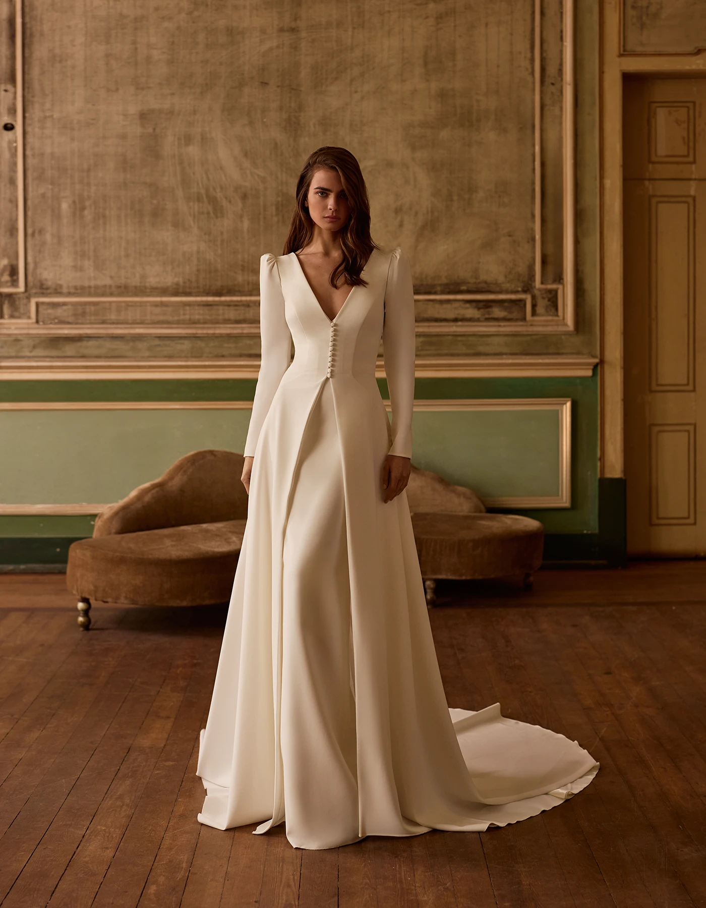 Vestido de novia sirena elaborado íntegramente en crepé que combina un escote en pico, con una falda moderna que lleva una abertura en la espalda. Tiene como complementos un abrigo com botonadura de novia o un abrigo tipo ablusado de gasa sedosa, ambos extraíbles, que dan efecto doble look.