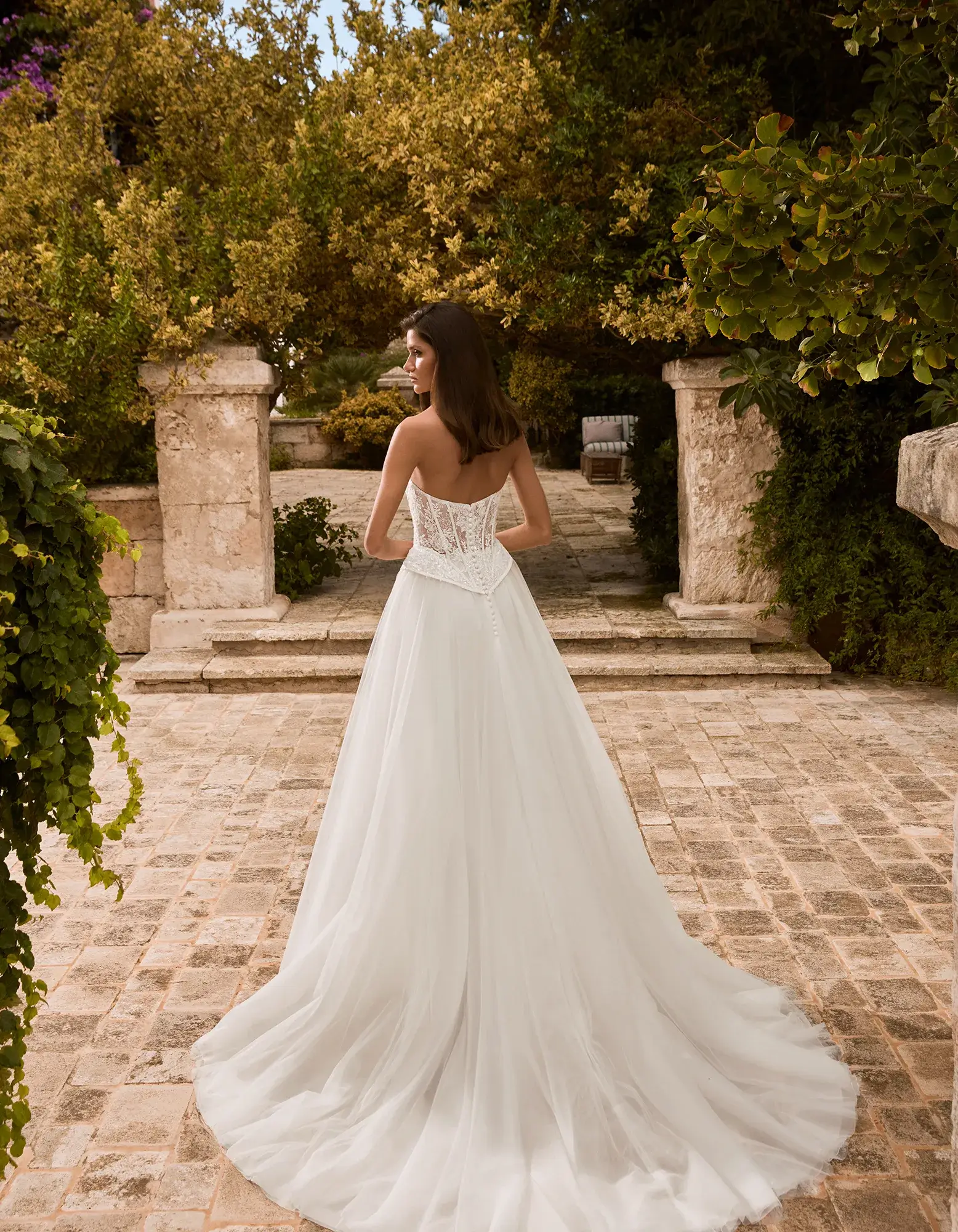 Vestido princesa de estilo romántico elaborado en tul que combina un corsé estructurado y escote corazón confeccionado con delicadas aplicaciones de flores 3D en el escote.