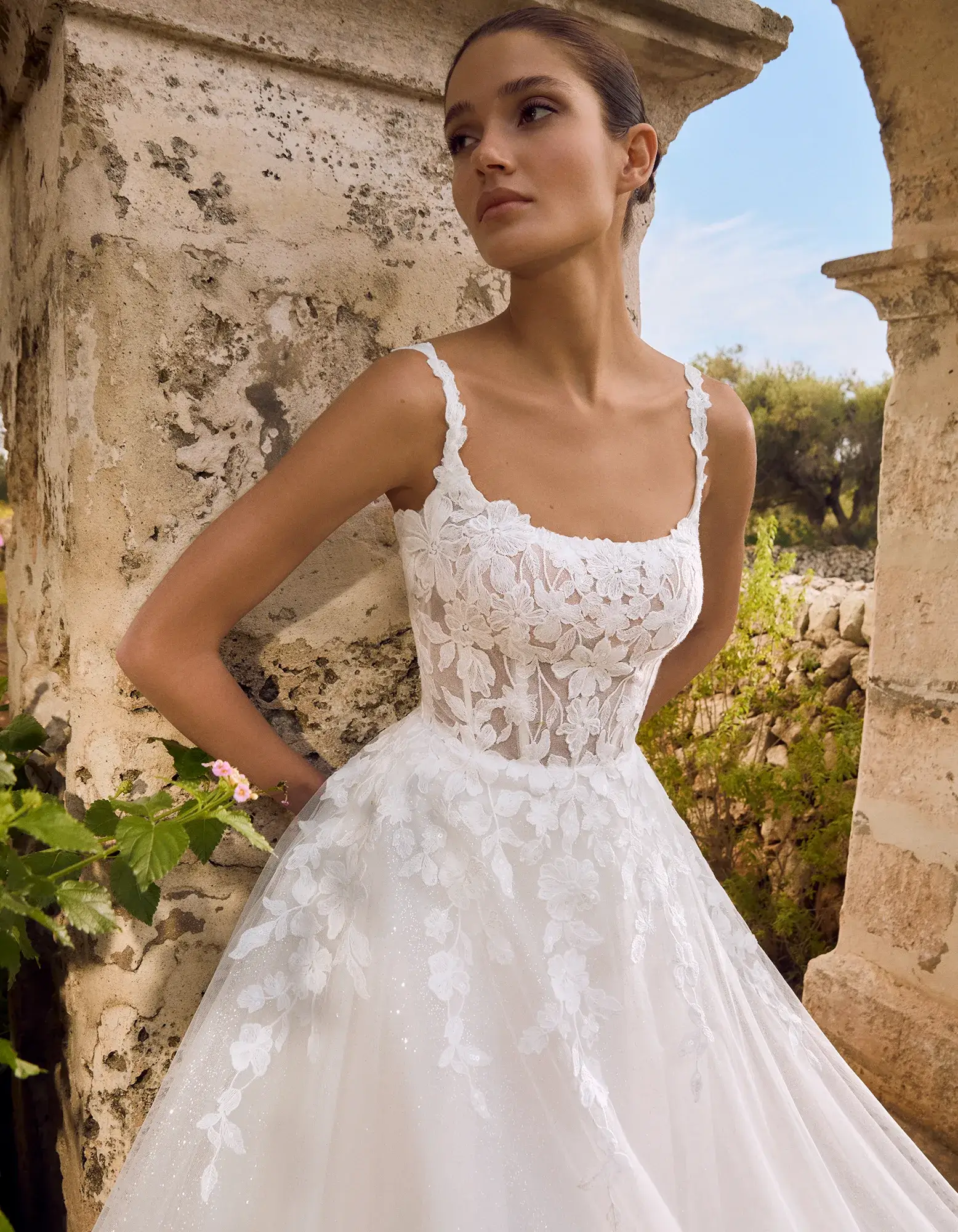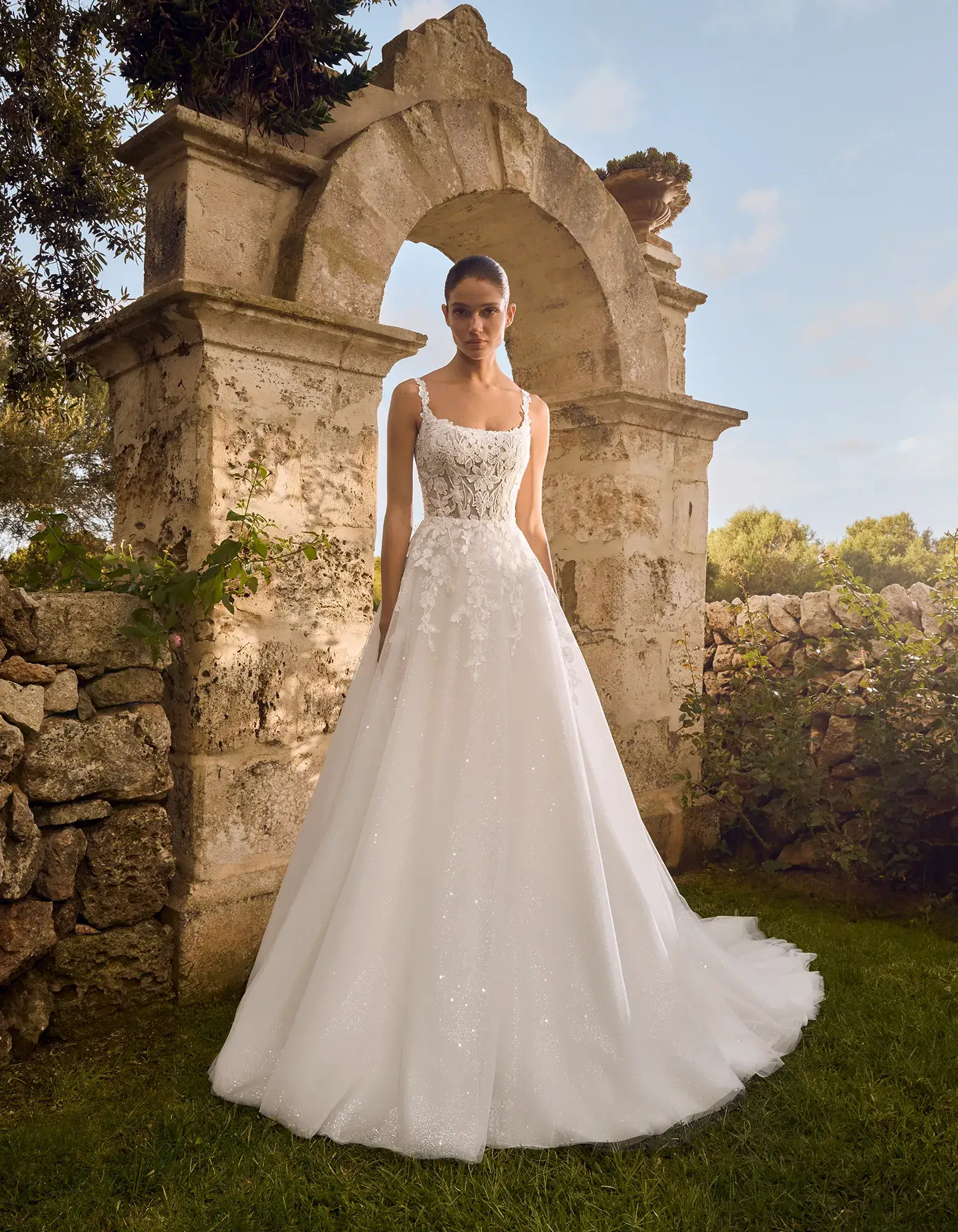 Vestido de línea A de estilo romántico que combina un cuerpo de escote cuadrado confeccionado en encaje con una falda de tul con glitter.