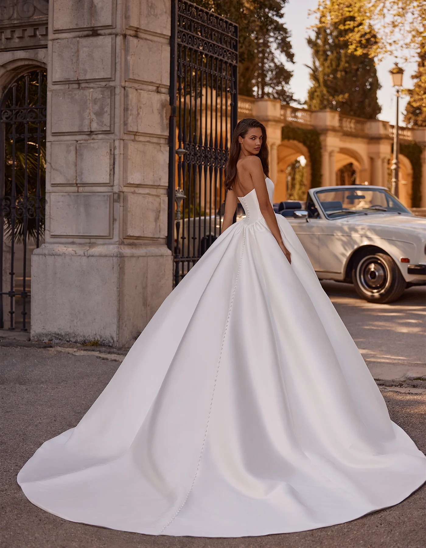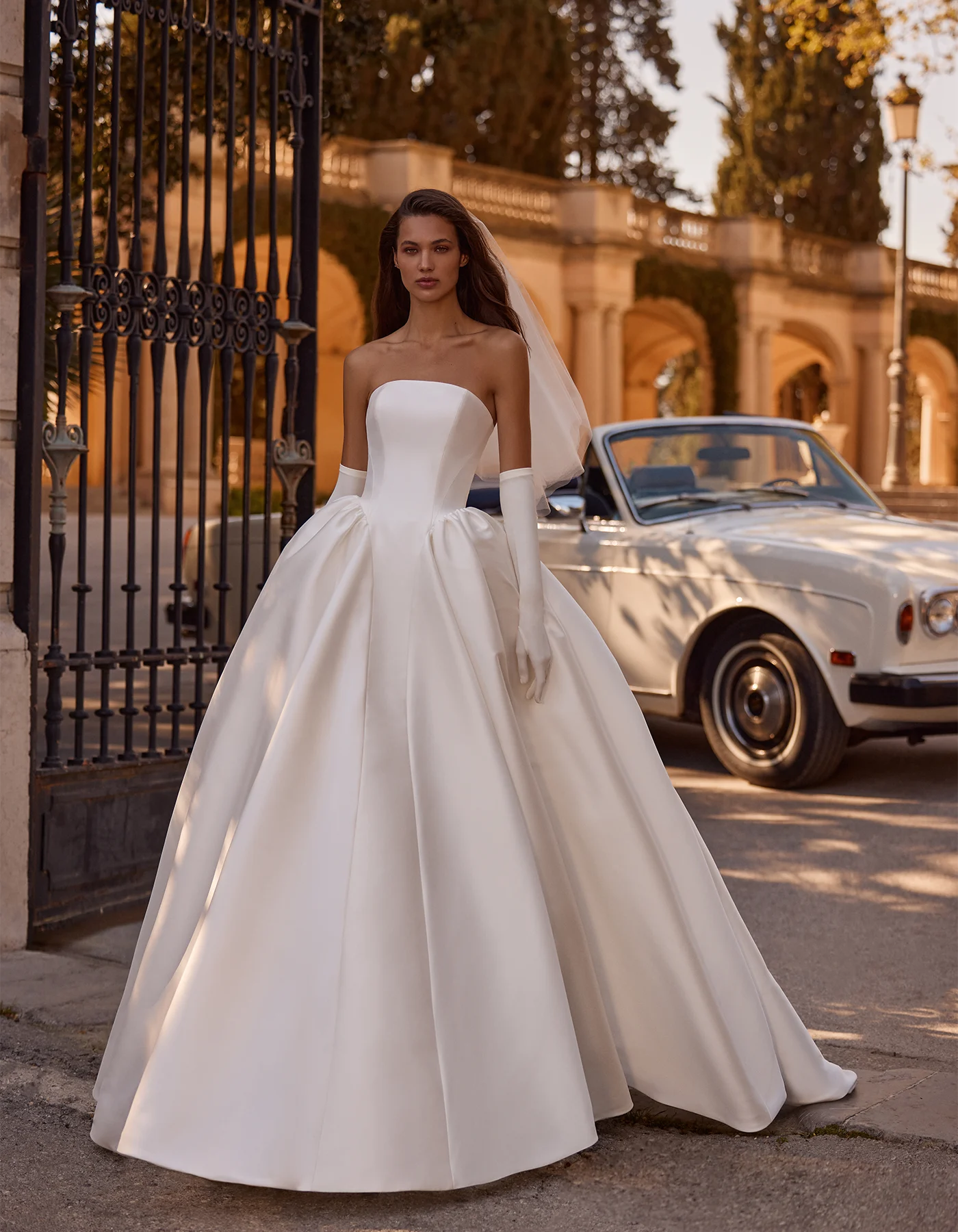Vestido de novia princesa, de estilo romántico y clásico. Presenta un cuerpo con cintura vasca con escote bañera, confeccionado íntegramente en mikado.