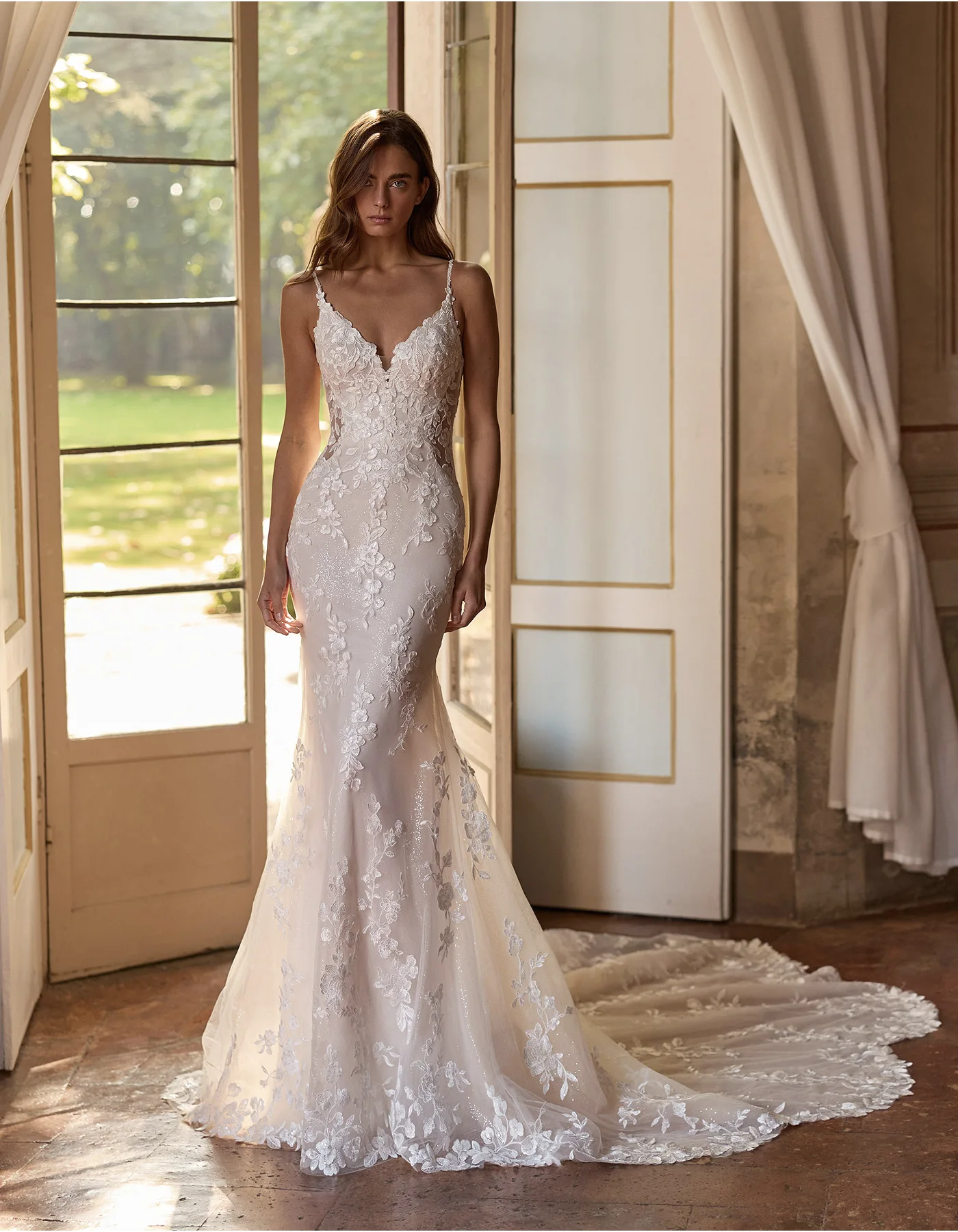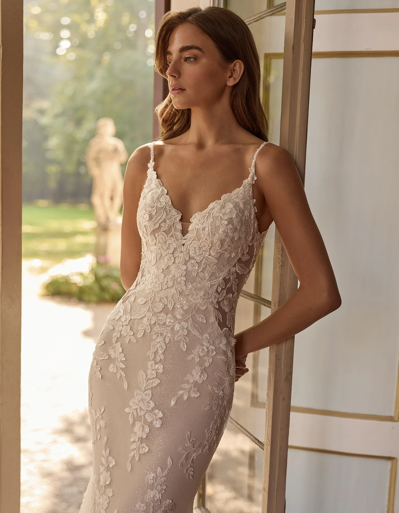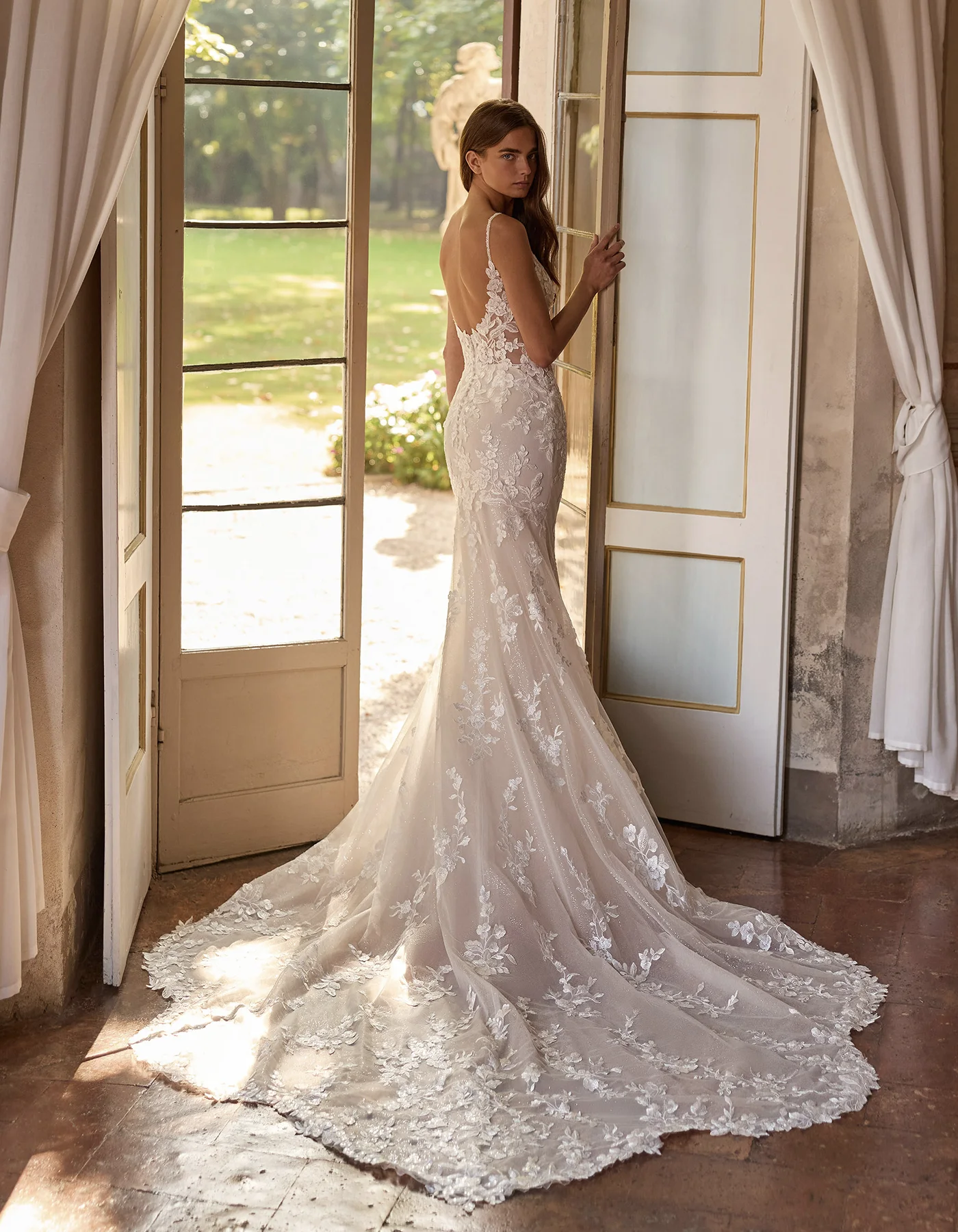 Vestido de novia sirena de estilo romántico. Elaborado íntegramente en tul glitter con delicadas aplicaciones de encaje floral, presenta un escote en V y transparencias en los laterales. Tiene la espalda descubierta y una amplia cola.
