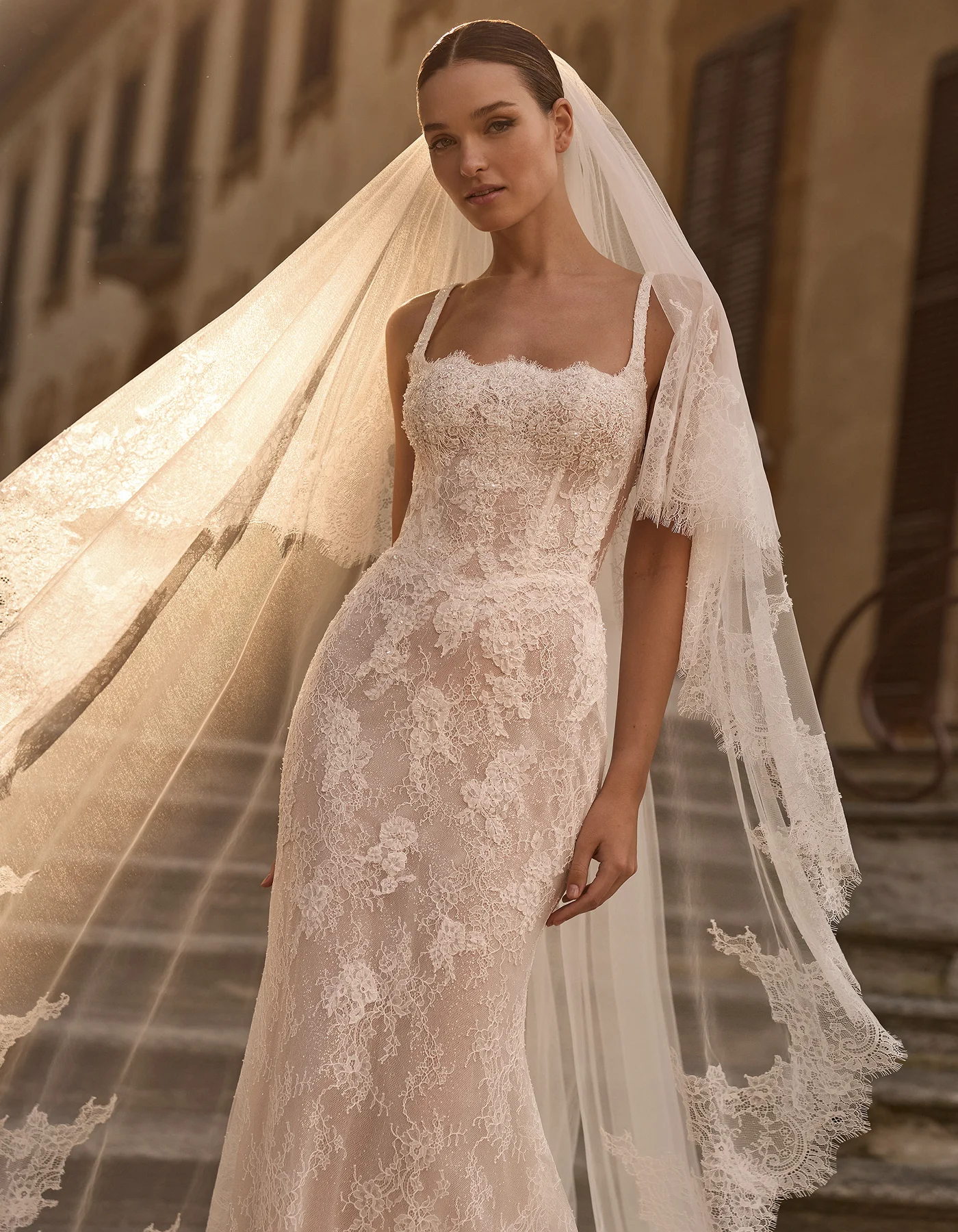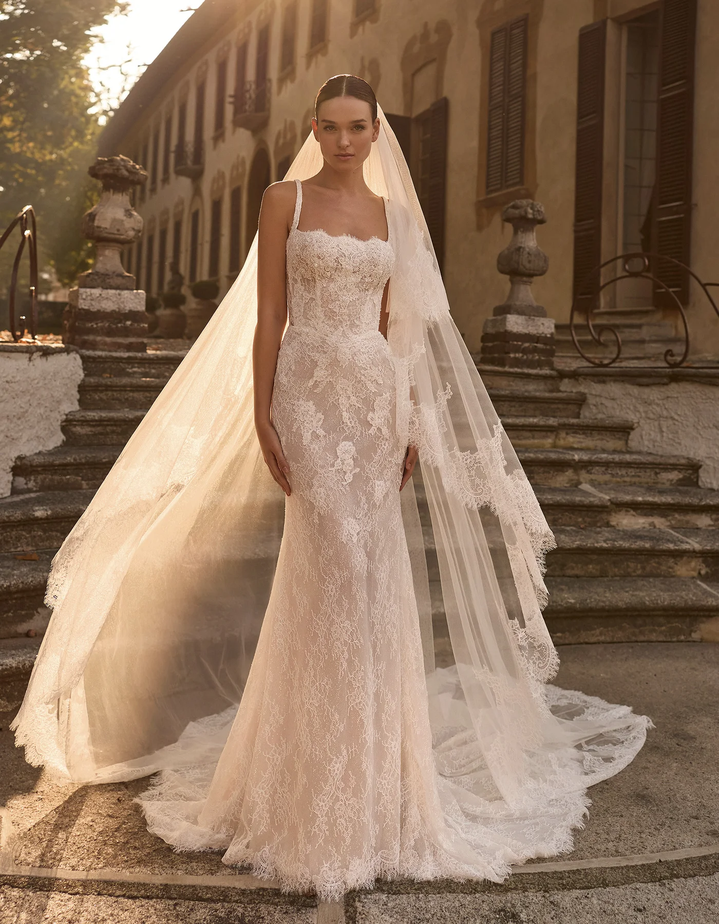 Vestido de novia sirena de estilo romántico. Elaborado en tul glitter con delicadas aplicaciones de encaje floral, presenta un escote cuadrado y tirantes. La espalda en V lleva un lazado tipo corsé. Lleva como complemento un velo en tul con aplicaciones del mismo encaje.
