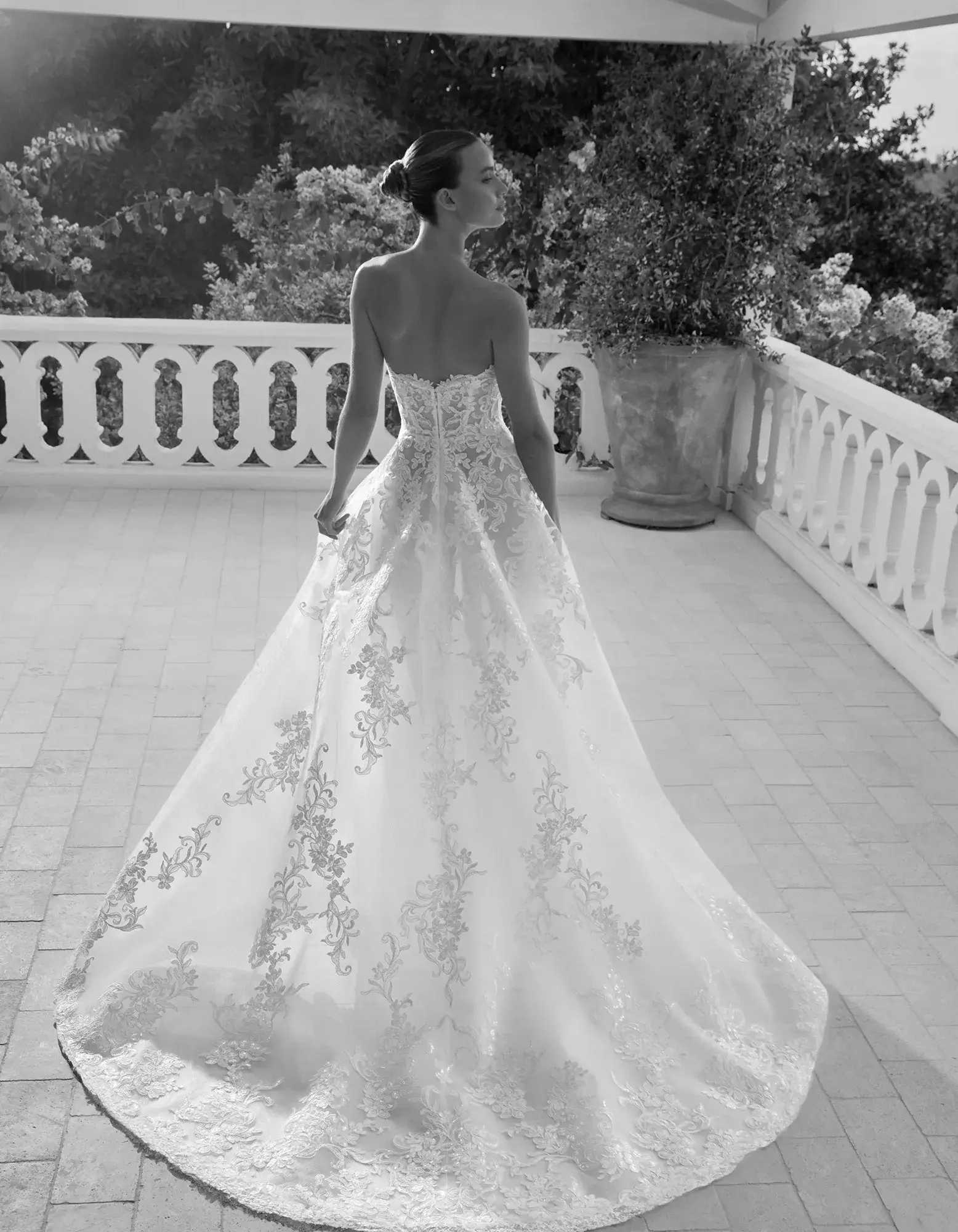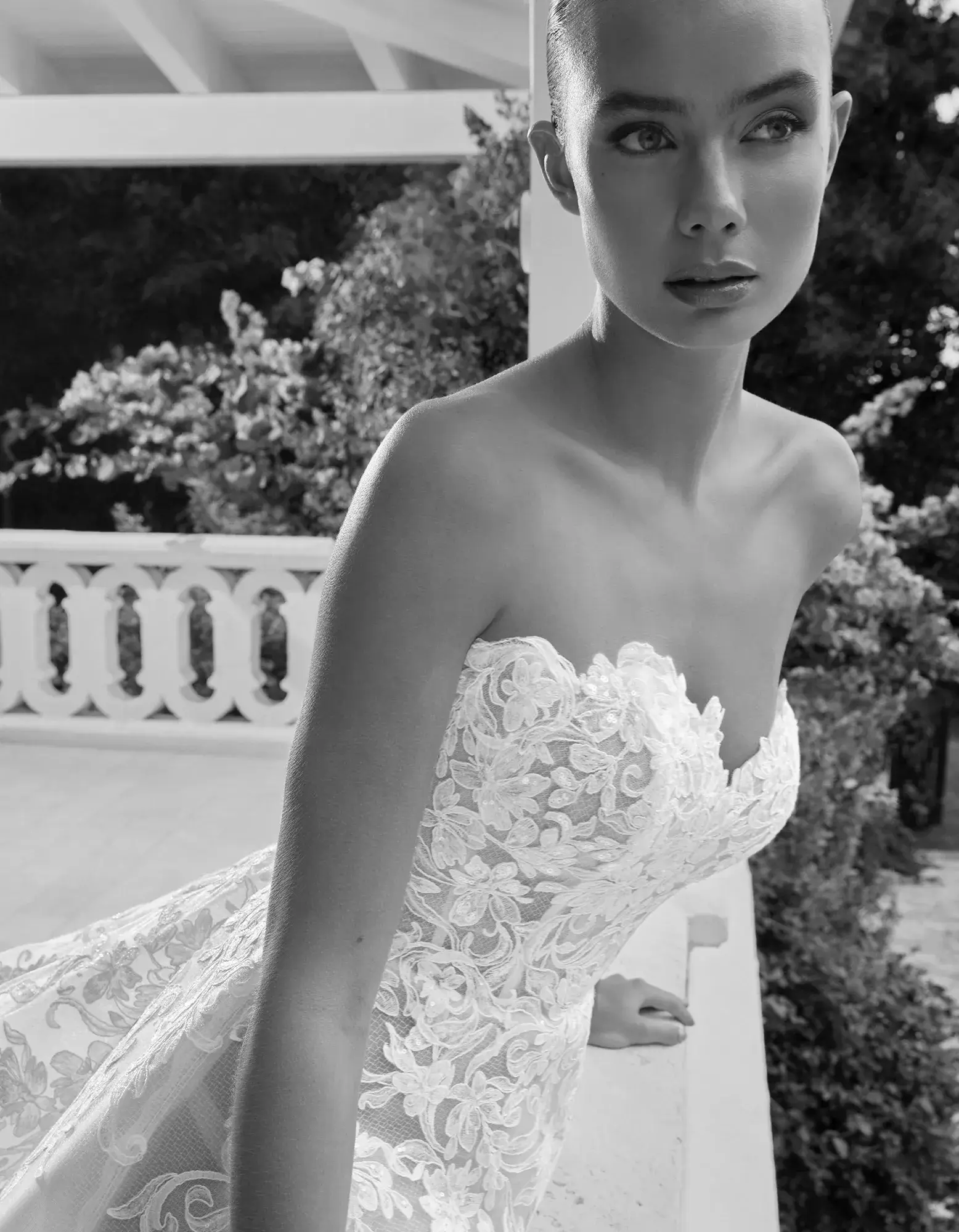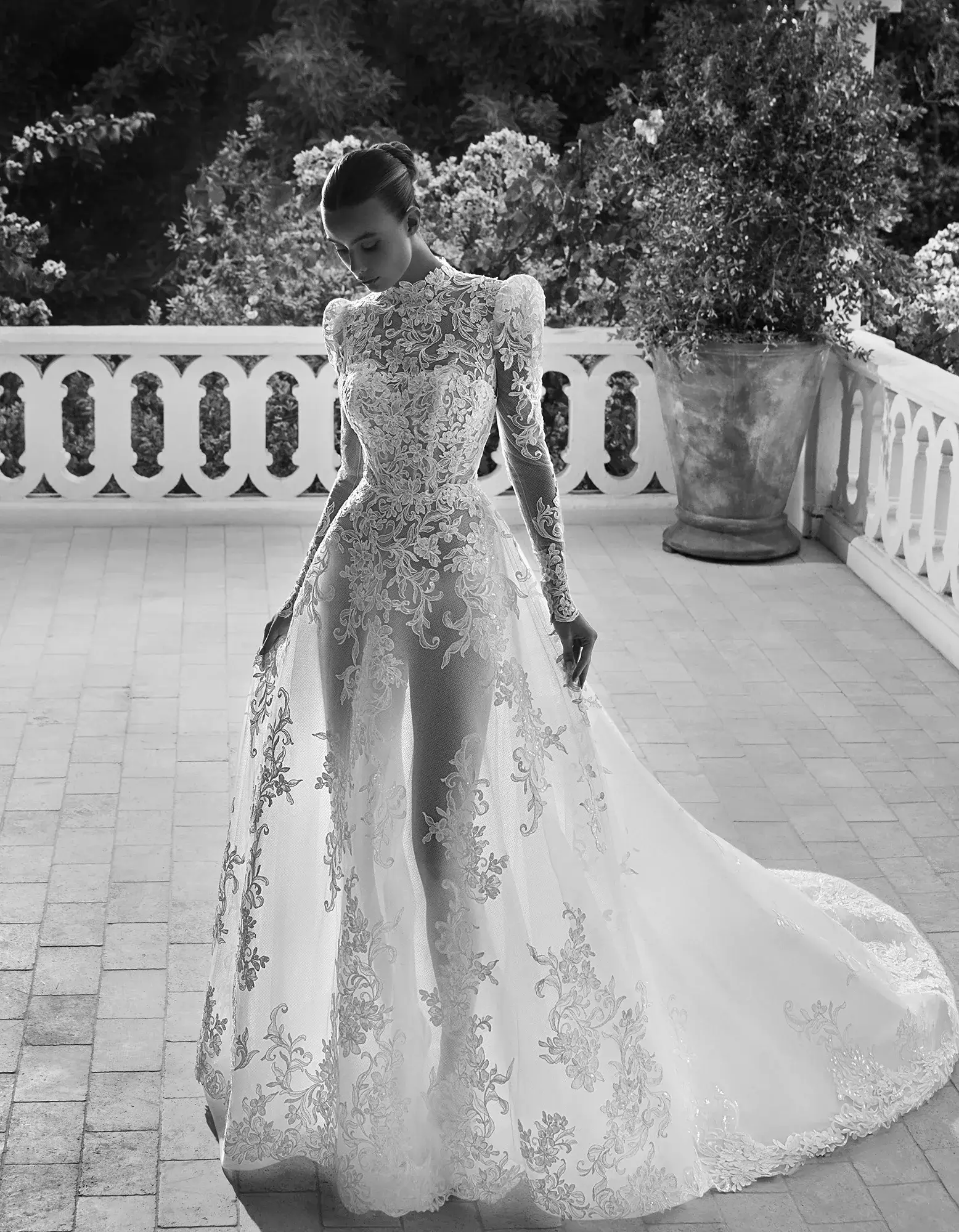 Vestido de línea A de estilo romántico que combina un cuerpo bañera confeccionado con delicadas aplicaciones de encaje sobre una falda. Presenta un abrigo de mangas largas y cuello alto extraíble, que da efecto doble look.