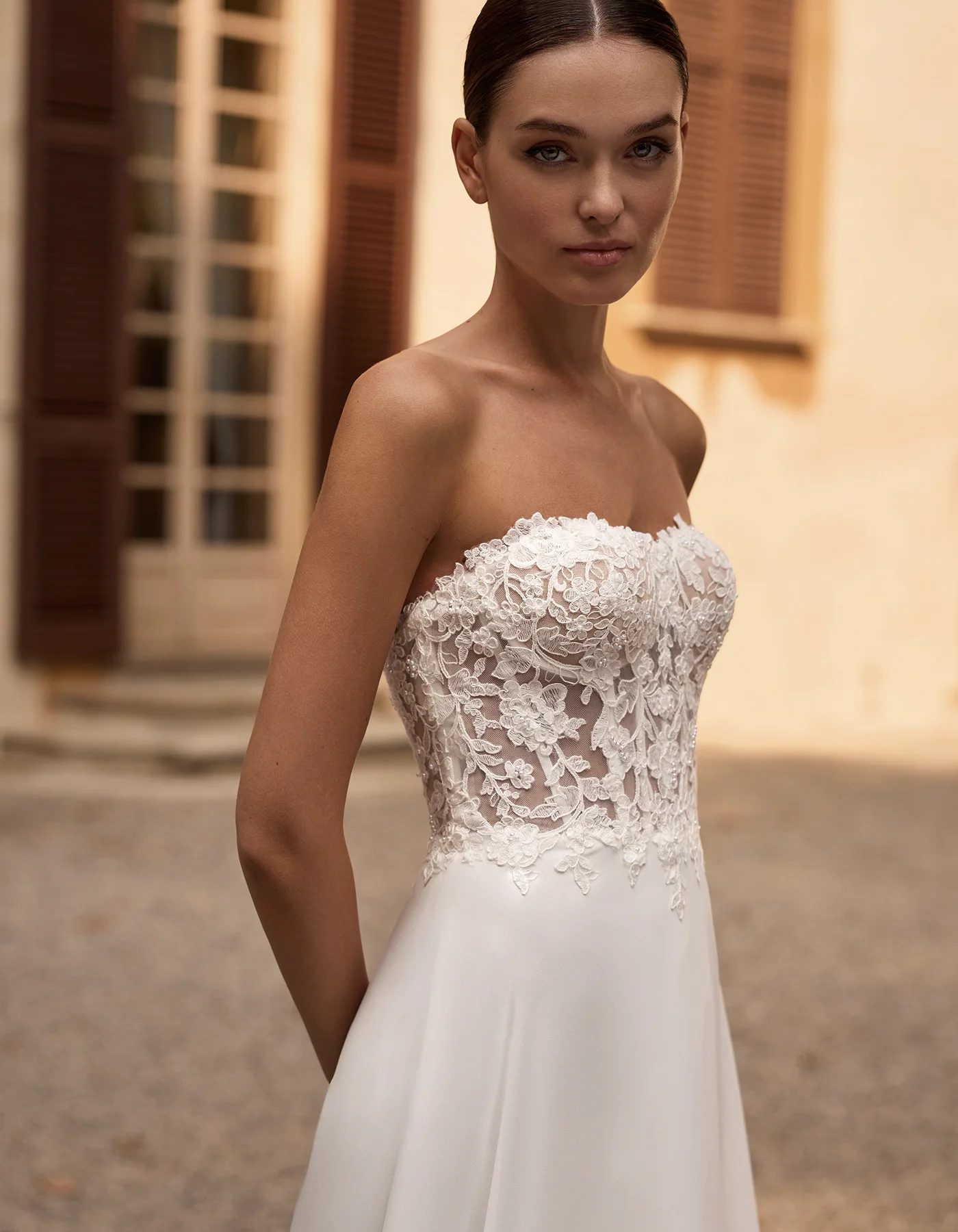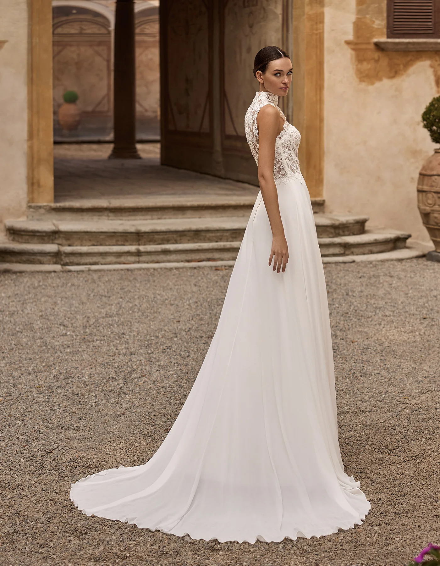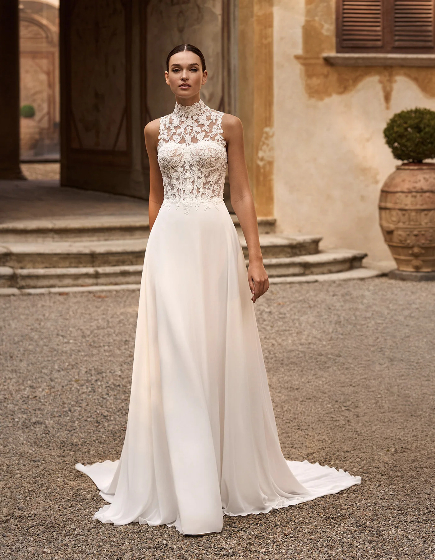 Vestido de novia línea A de estilo clásico, que combina un cuerpo corsé de escote corazón elaborado con delicadas aplicaciones de tul bordado, sobre una falda de gasa sedosa. Lleva como complemento una chaqueta de cuello alto de encaje, creando un efecto de escote halter.