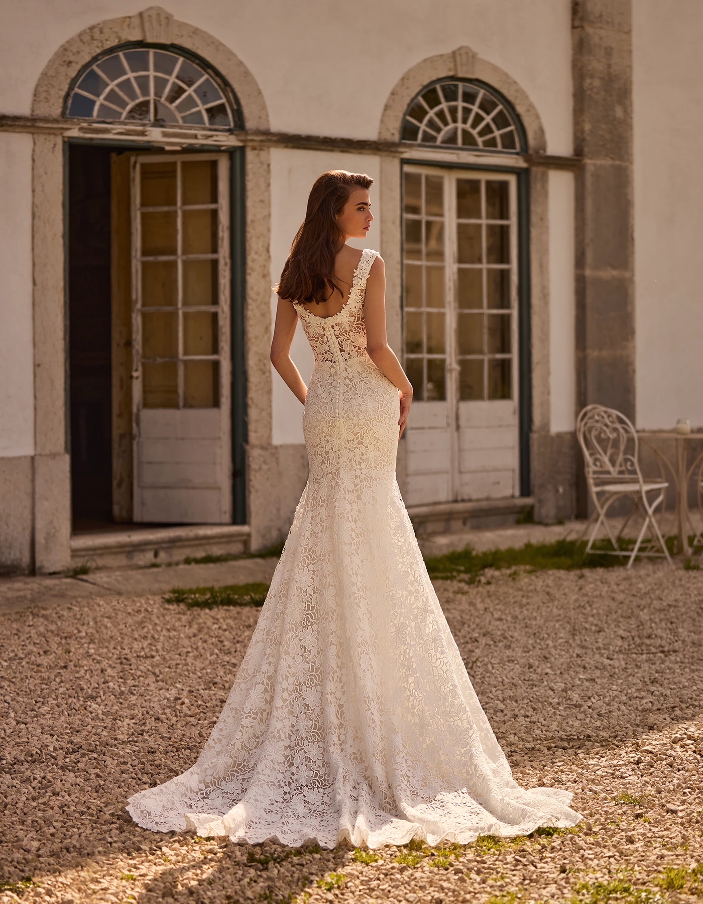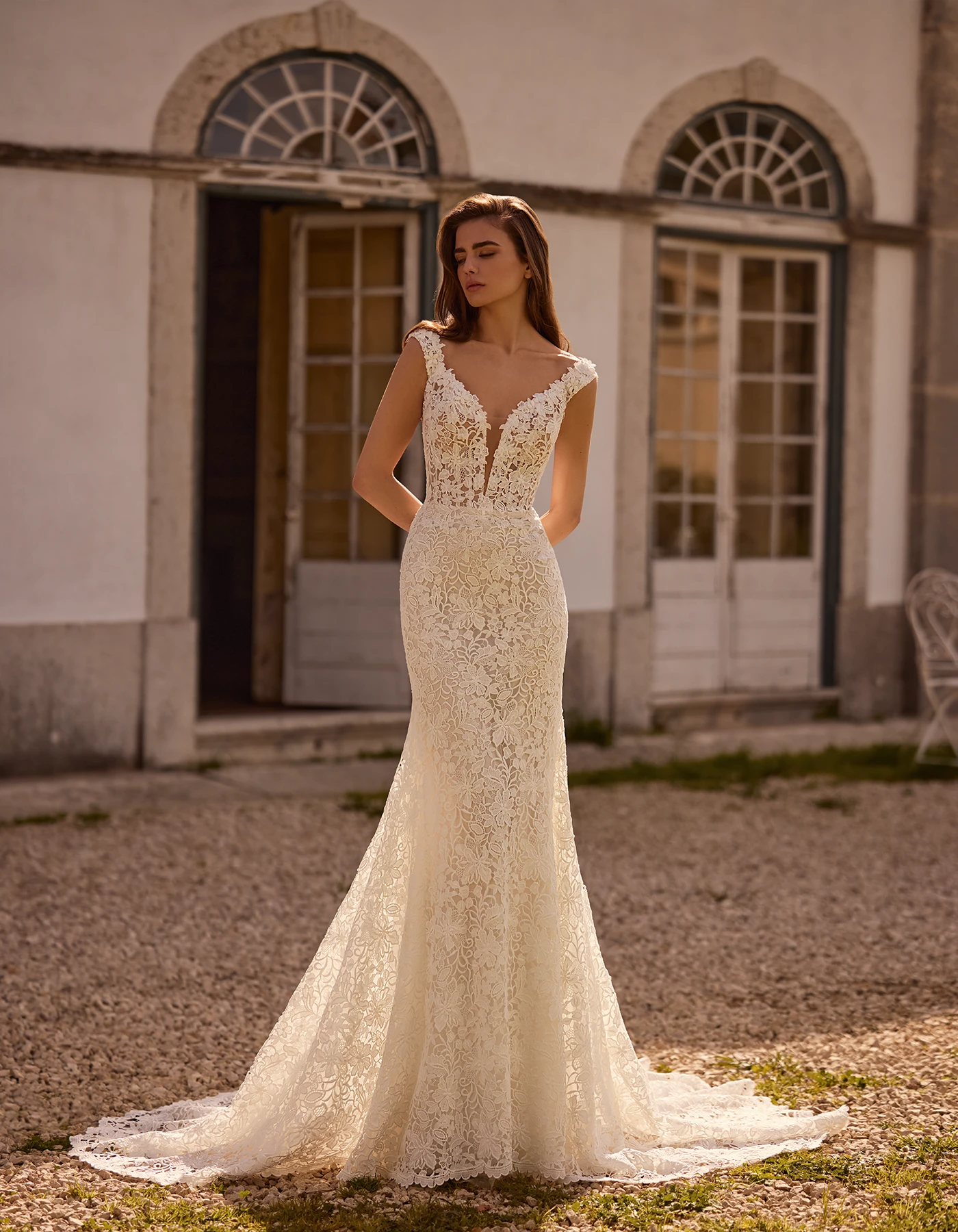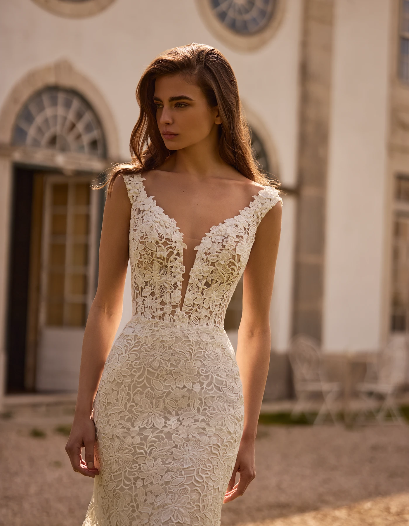 Vestido de novia sirena de estilo romántico elaborado íntegramente en encaje tipo guipur. Presenta un escote en pico abierto y una falda ajustada.