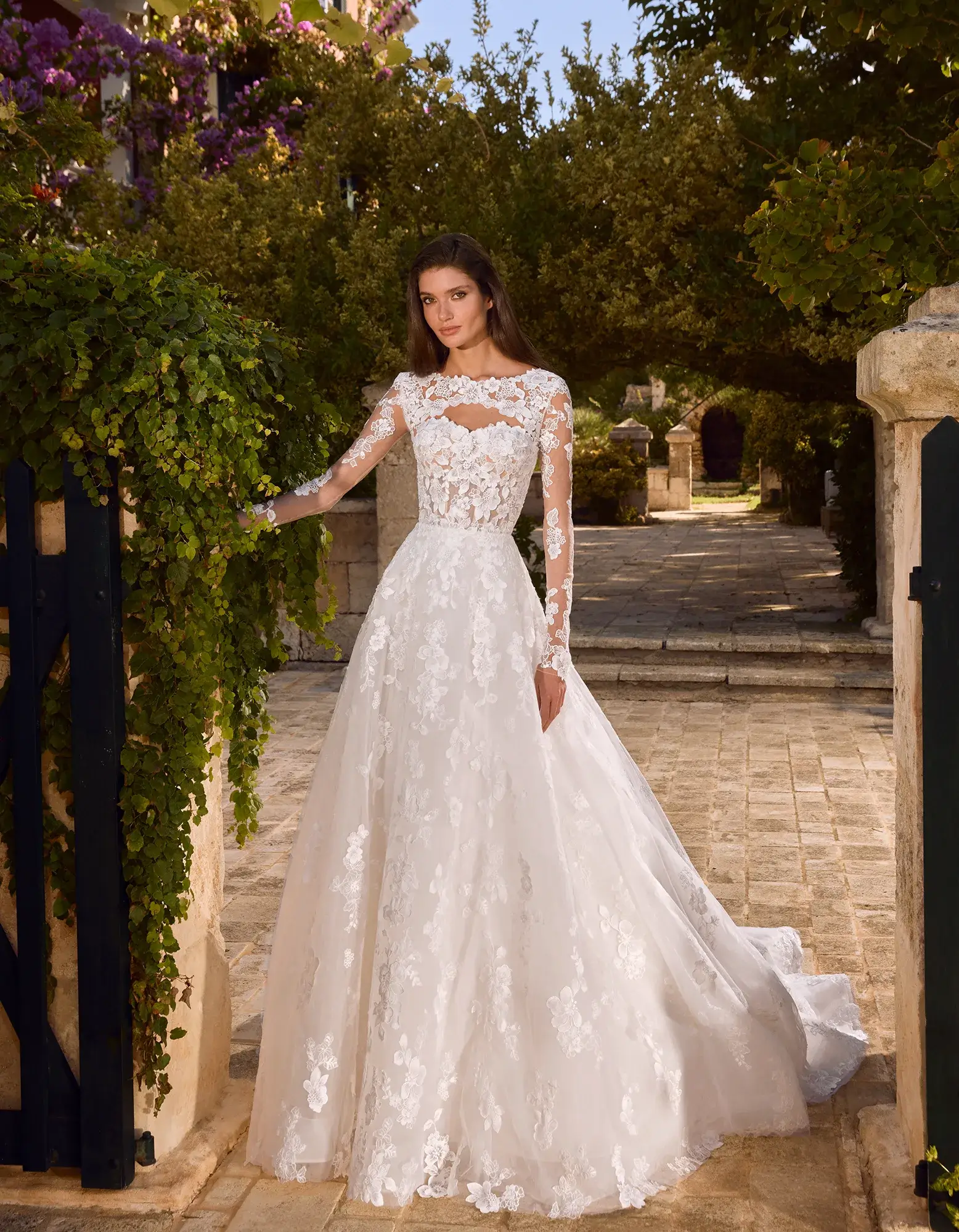 Vestido de línea A de estilo clásico elaborado con aplicaciones de encaje y que presenta un cuerpo corset y una chaqueta de manga larga, generando efecto de doble look.