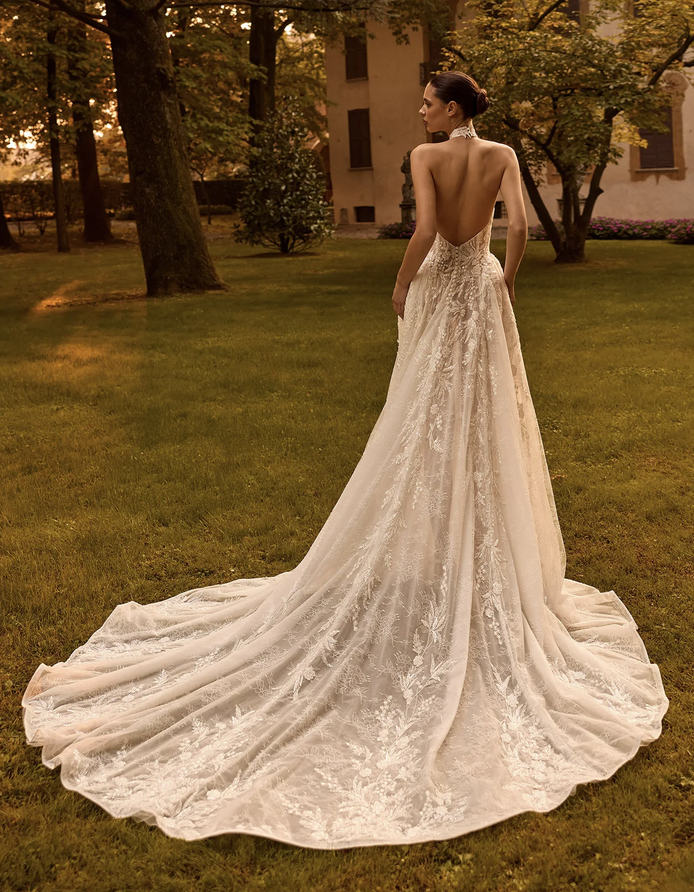 Vestido de novia princesa de la Colección Couture, de estilo romántico y moderno. Elaborado íntegramente en encaje chantilly con aplicaciones de pedrería bordadas. Presenta un cuello halter y un escote profundo en la espalda, decorado con una fila de botones. La falda tiene una amplia cola.