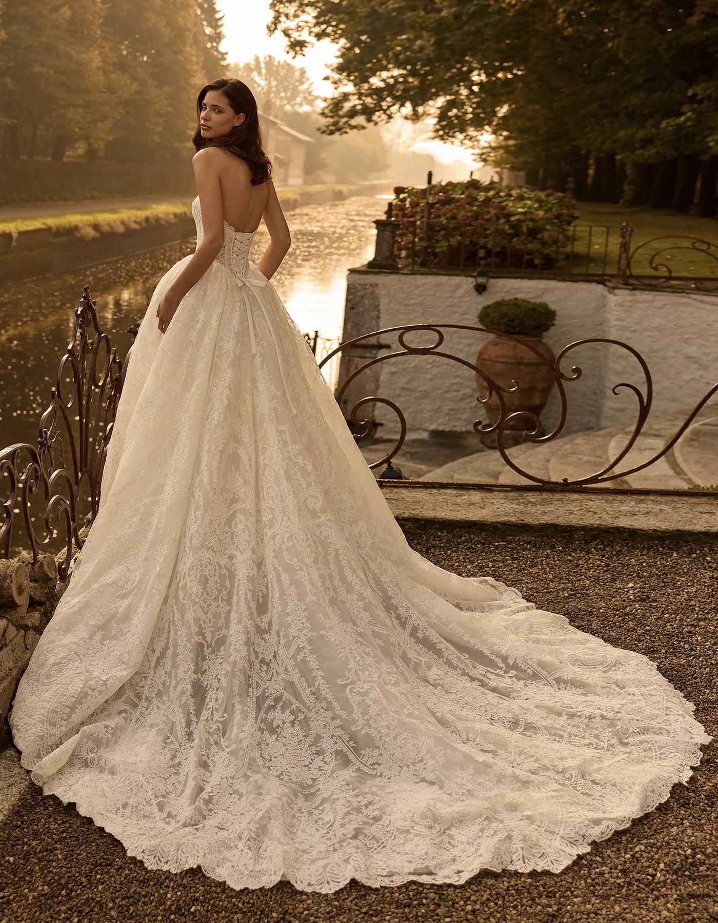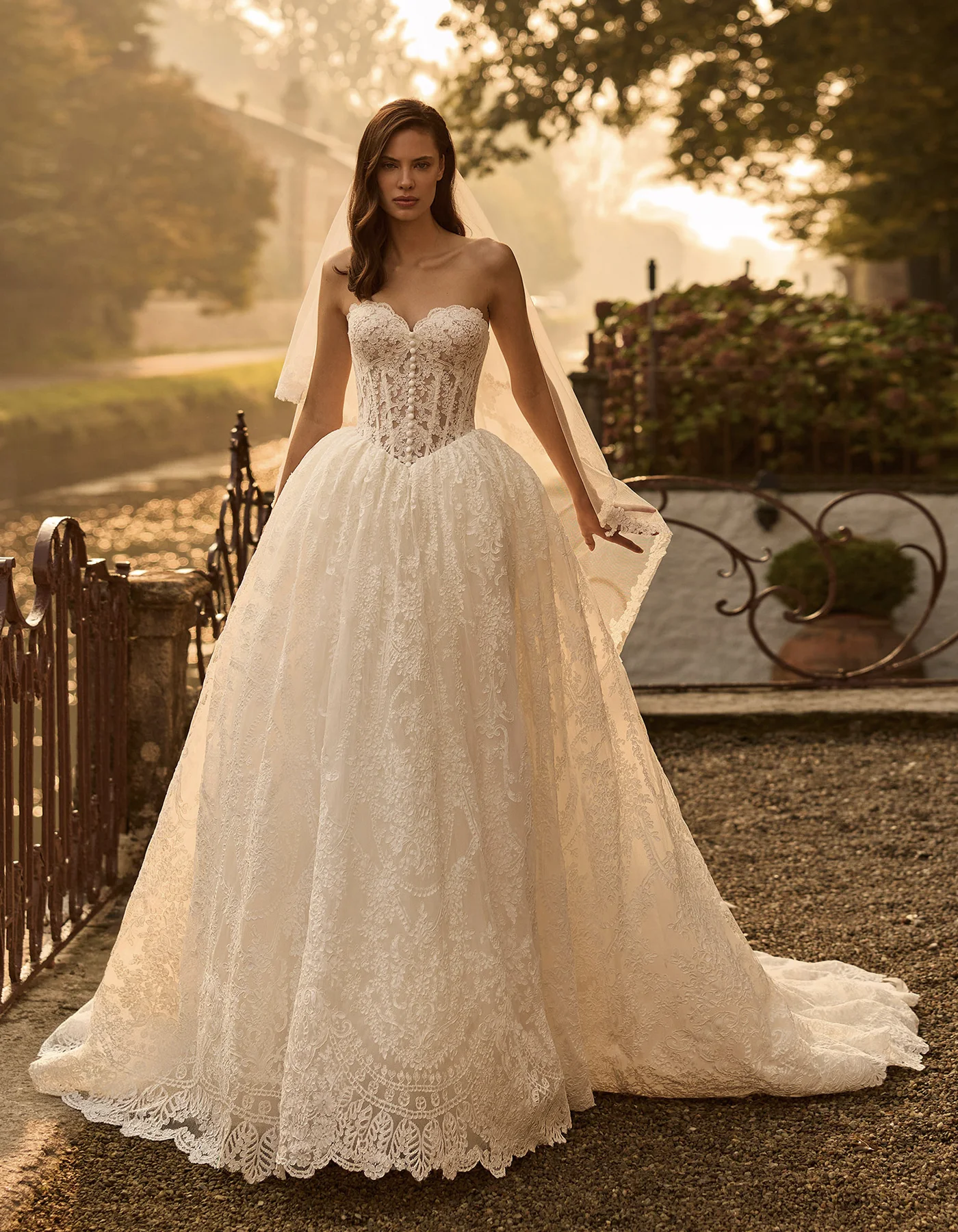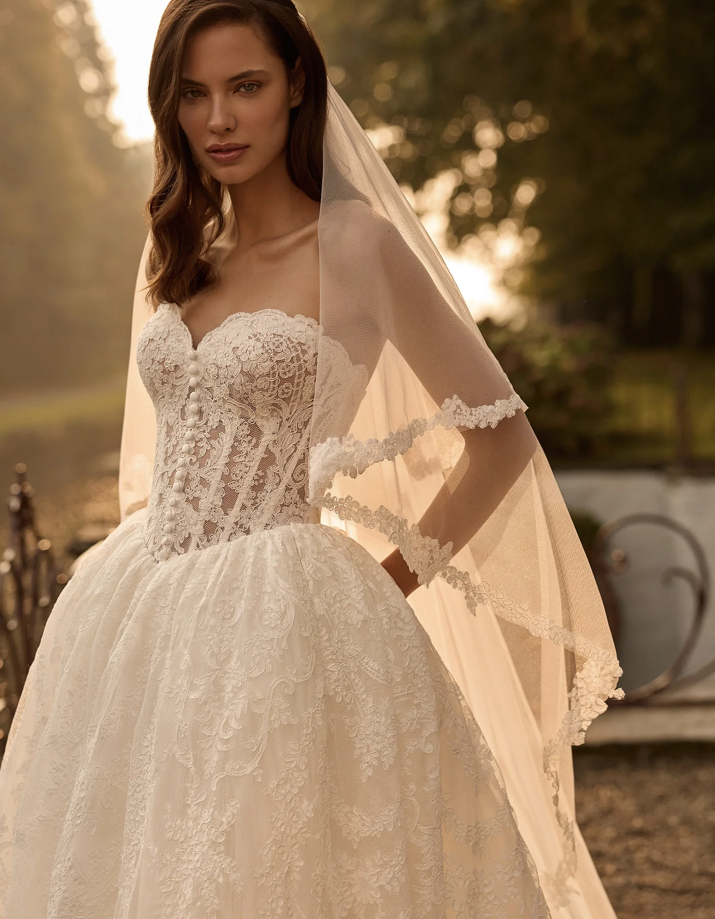 Vestido de novia princesa de la Colección Couture, de estilo clásico y romántico, elaborado íntegramente en elegante encaje rebrodé. Presenta un cuerpo corsé estructurado decorado con una fila de botones. En la espalda presenta un lazado tipo corsé, bajo una amplia falda. Lleva como complemento un velo de tul con aplicaciones de encaje bordadas.
