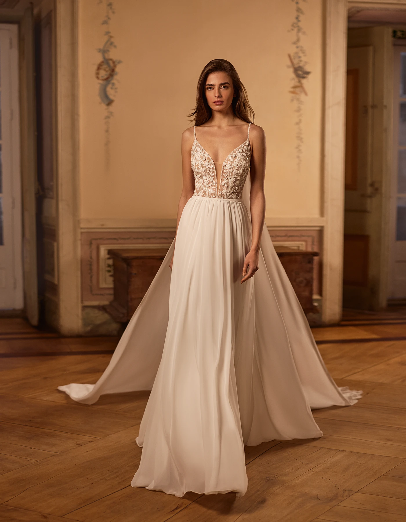 Vestido de novia de línea A de estilo clásico que combina un cuerpo de escote pico, confeccionado con delicadas aplicaciones de encaje y flores 3D sobre una falda de gasa sedosa. Lleva como complemento dos colas de gasa extraíbles que dan efecto doble look.