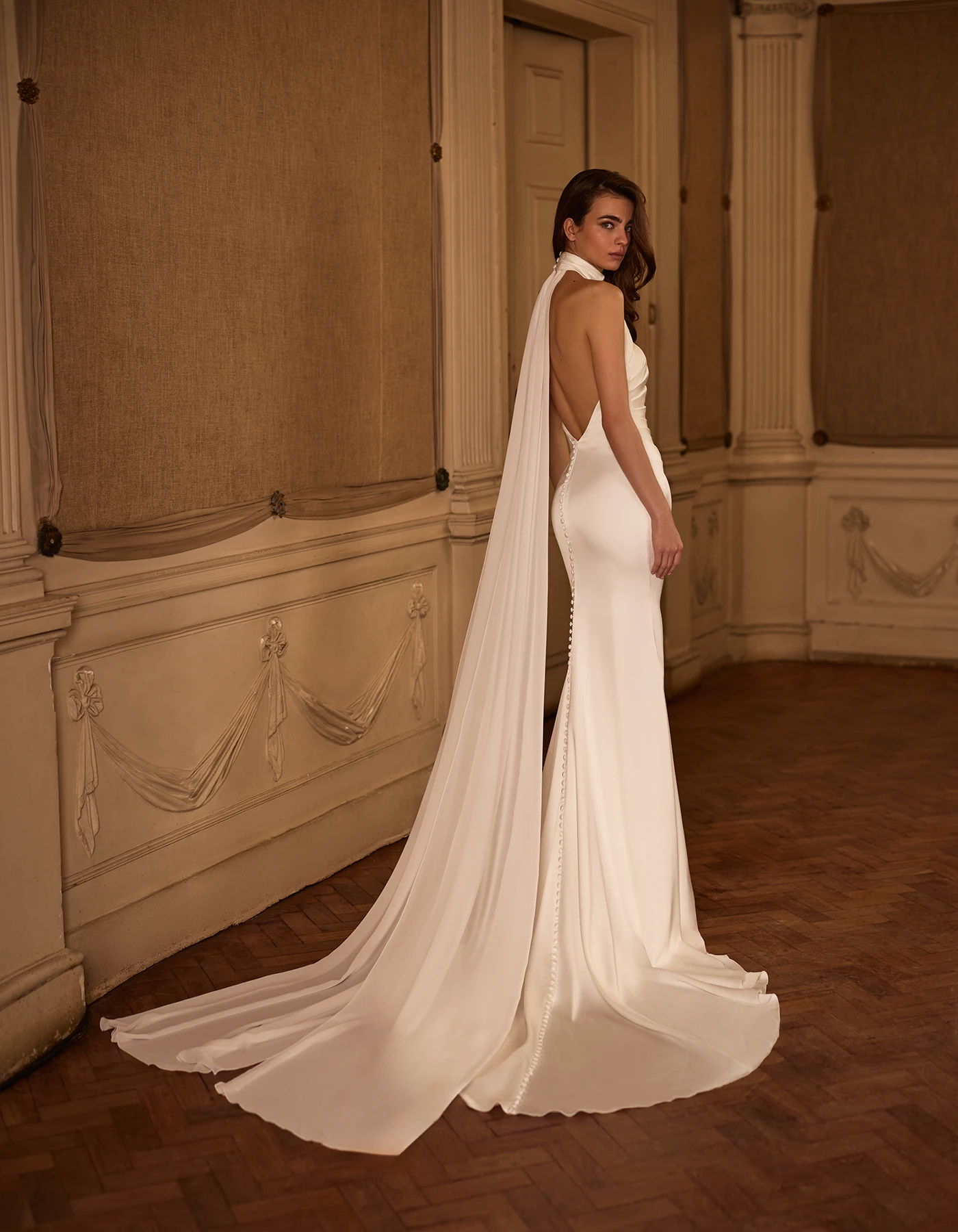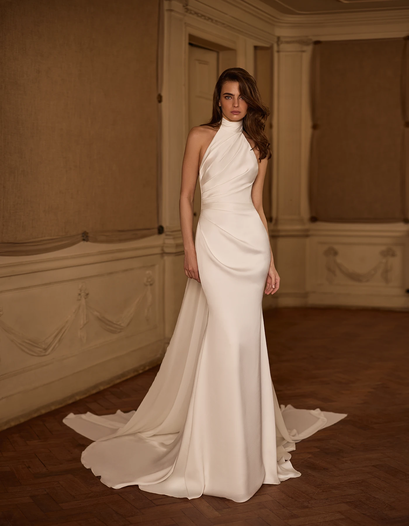 Vestido de novia sirena de estilo sencillo elaborado enteramente en raso mórbido. Presenta un cuerpo drapeado y sublimado con dos colas que salen del cuello.