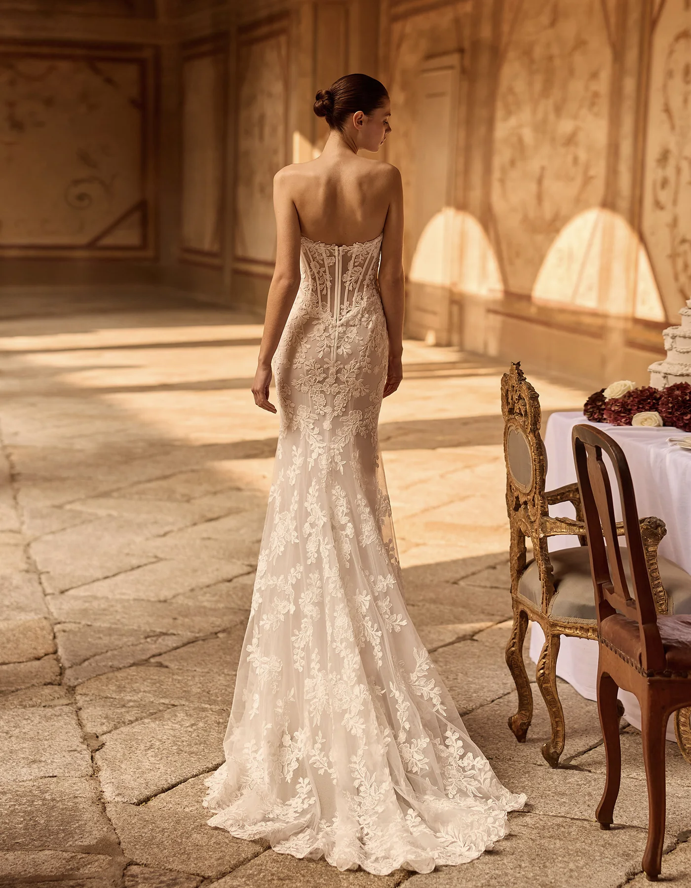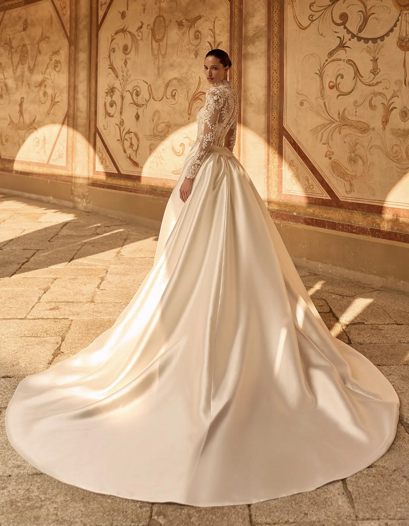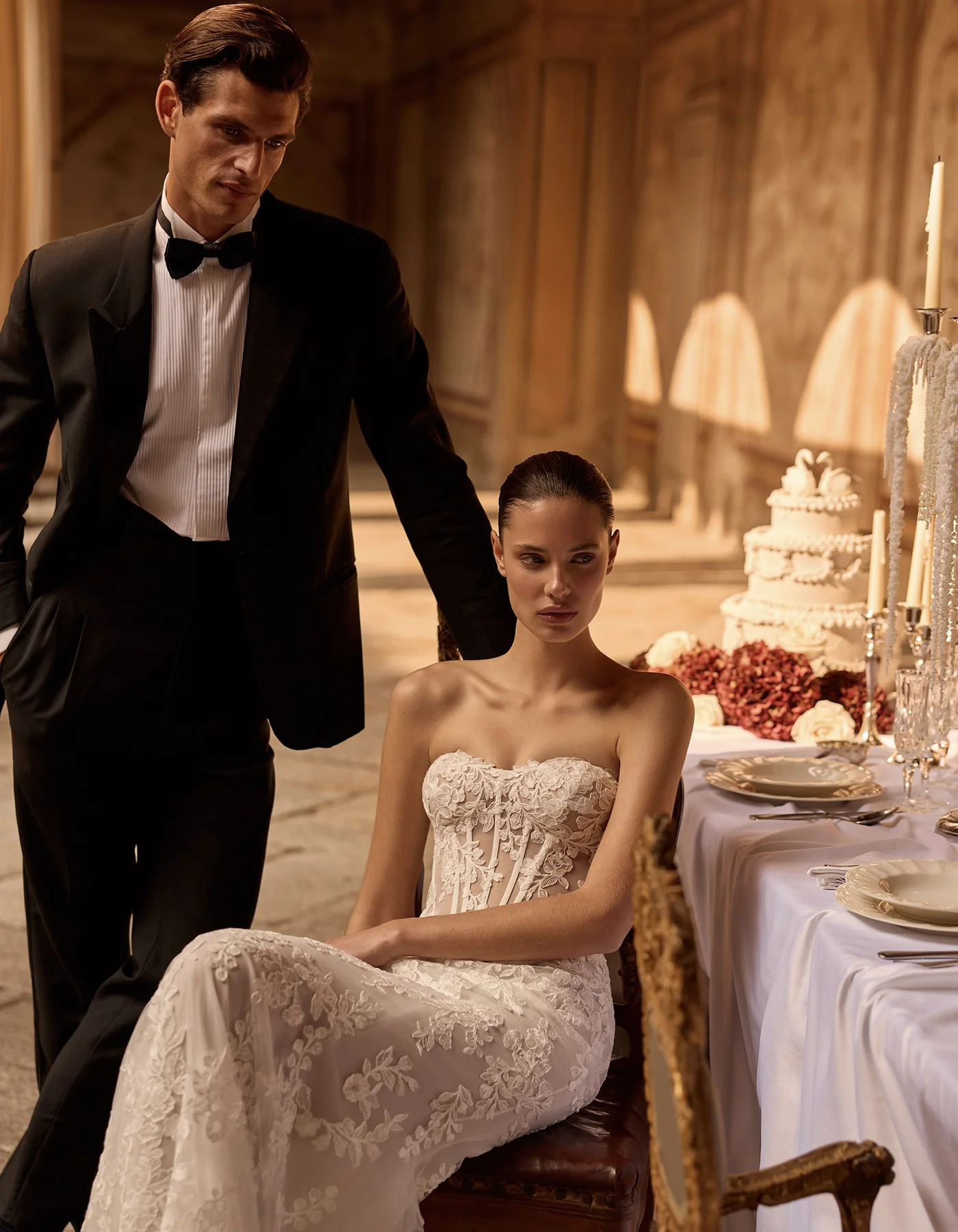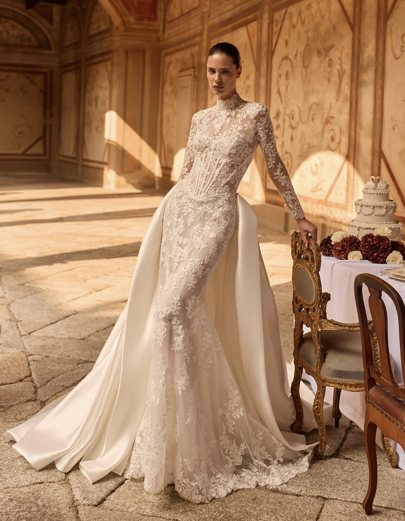 Vestido de novia sirena de la Colección Couture, de estilo moderno e icónico. Elaborado íntegramente en delicado encaje, presenta un cuerpo corsé estructurado de escote corazón, sobre falda de línea sirena. Lleva como complementos una amplia sobrefalda en raso extraíble, que crea un look impactante, y una chaqueta de encaje que da un efecto doble look.