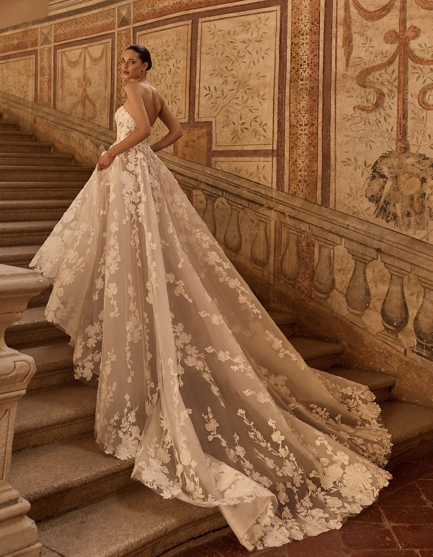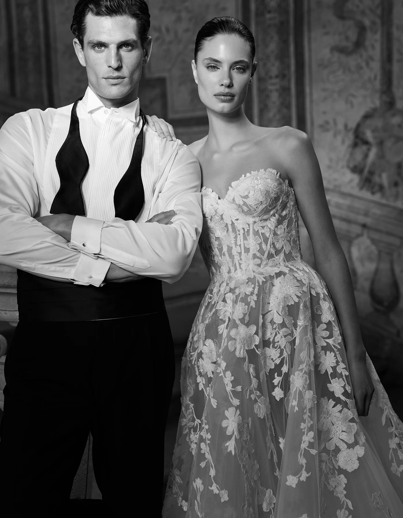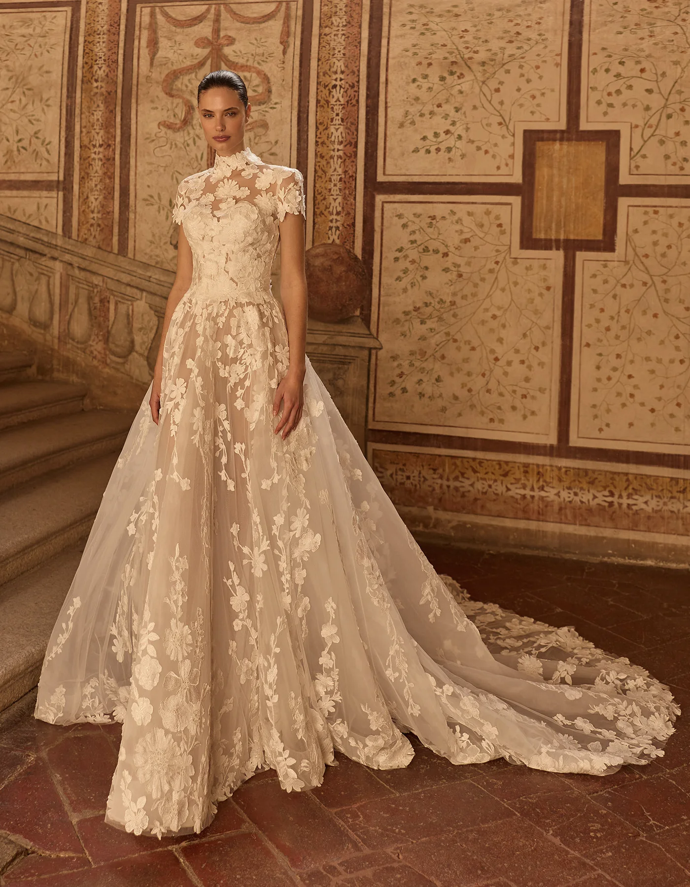 Vestido de novia línea A de la Colección Couture, de estilo romántico y moderno. Elaborado íntegramente en tul con encaje de motivos florales bordado. Presenta un cuerpo corsé de escote corazón, sobre una amplia falda. Lleva como complemento una chaqueta de manga corta y cuello alto que permite crear un doble look.