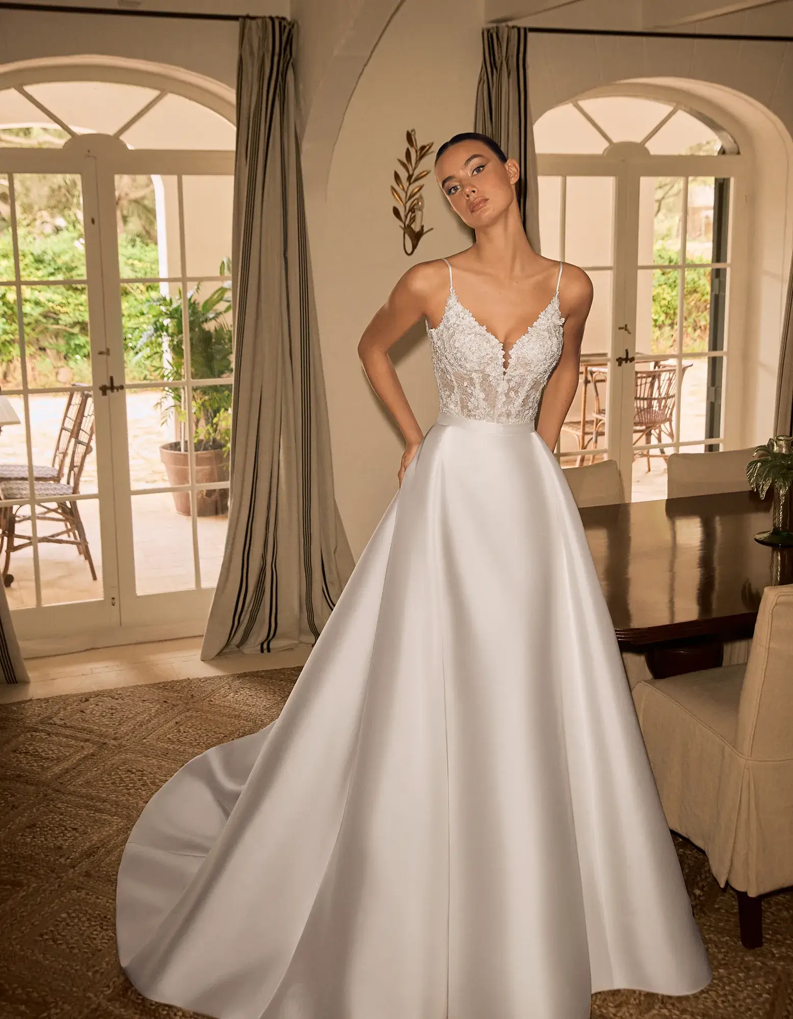 Vestido princesa de estilo clásico que combina un vestido corto ajustado con escote pico confeccionado con delicadas aplicaciones de encaje sobre una falda de mikado.