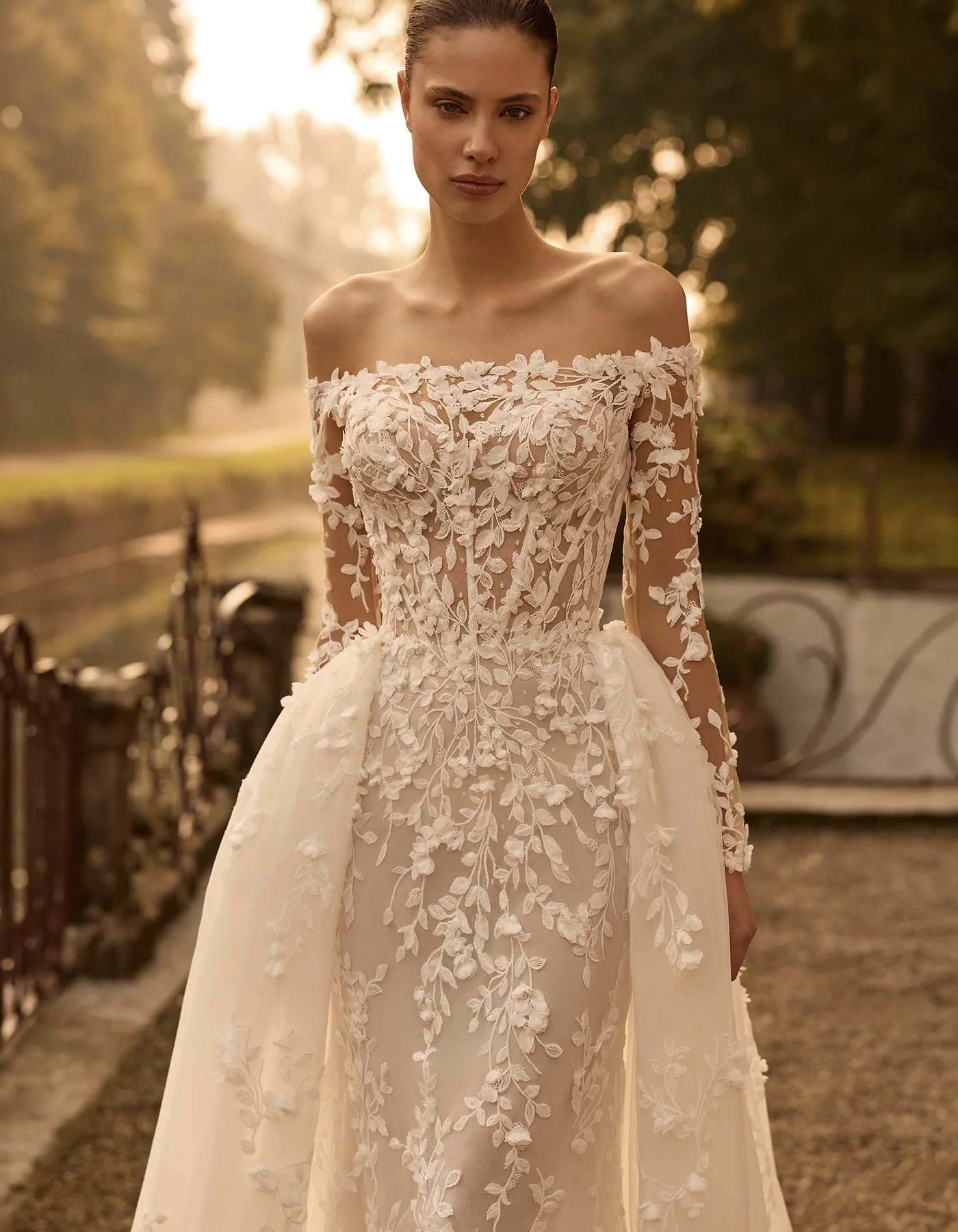 Vestido de novia sirena de la Colección Couture, de estilo moderno y romántico. Elaborado íntegramente en tul con delicado encaje decorado con pequeñas hojas. Presenta un cuerpo corsé estructurado de escote envolvente y mangas largas en transparencia de tul bordado con encaje. Lleva como complemento una amplia sobrefalda extraíble que da un efecto doble look.