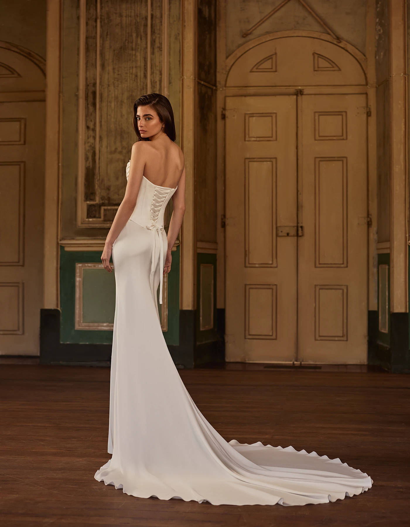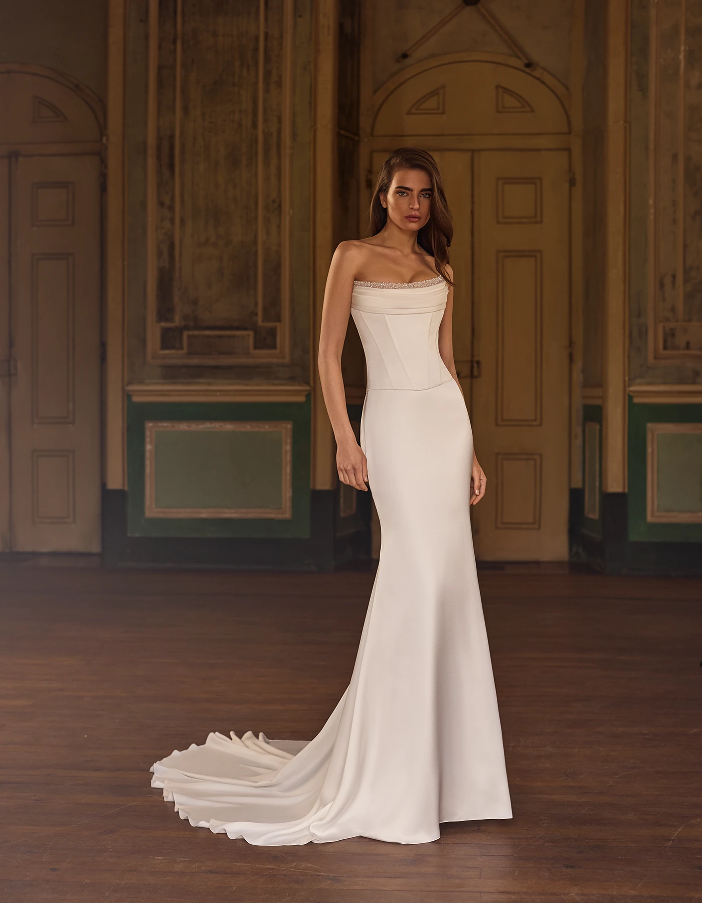 Vestido de novia sirena de estilo moderno que combina un cuerpo corsé estructurado, confeccionado con bordado de pedrería en el escote sobre una falda de raso mórbido.